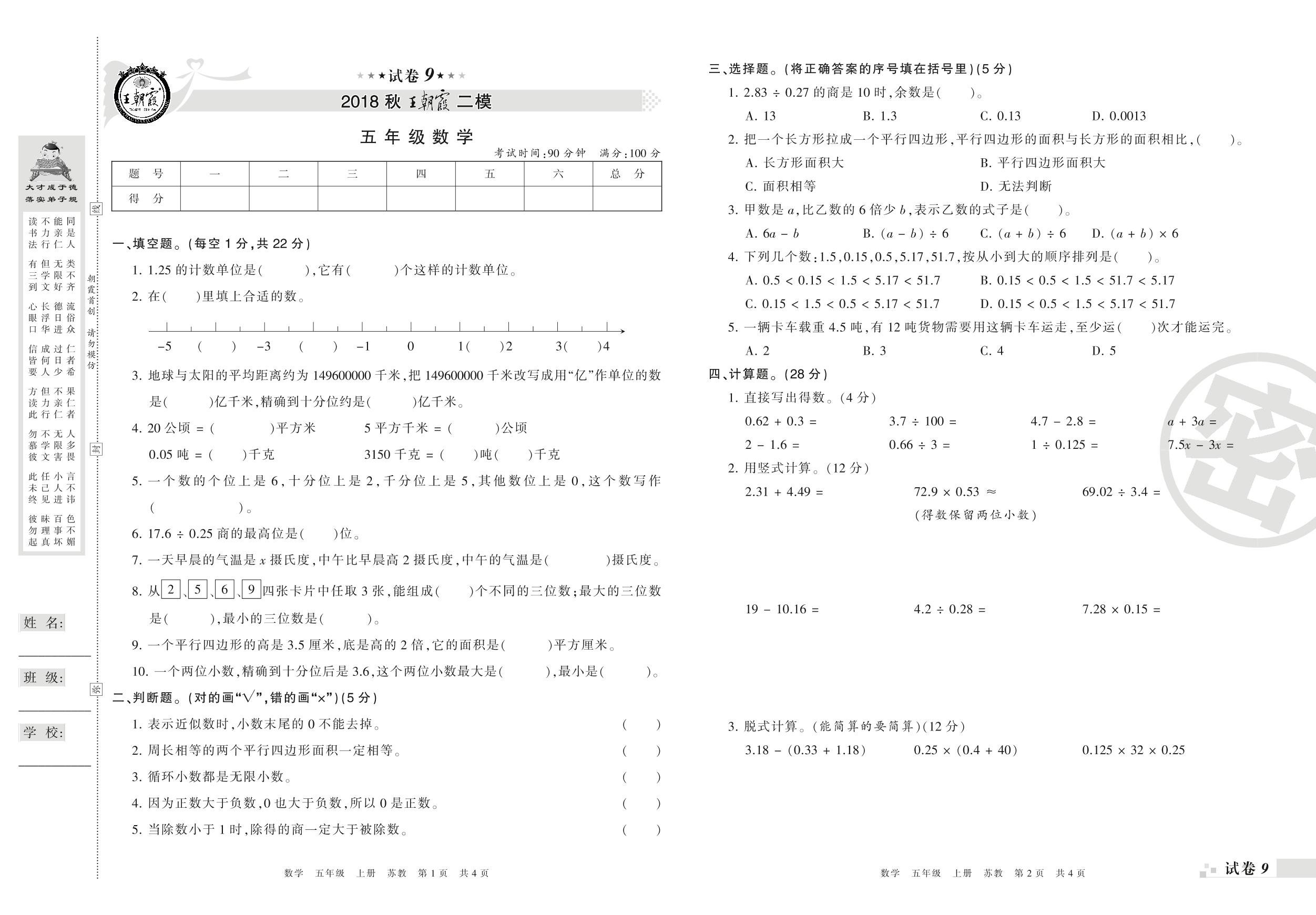 王朝霞期末模拟卷五年级上册数学(苏教版)_R210804185628【9】