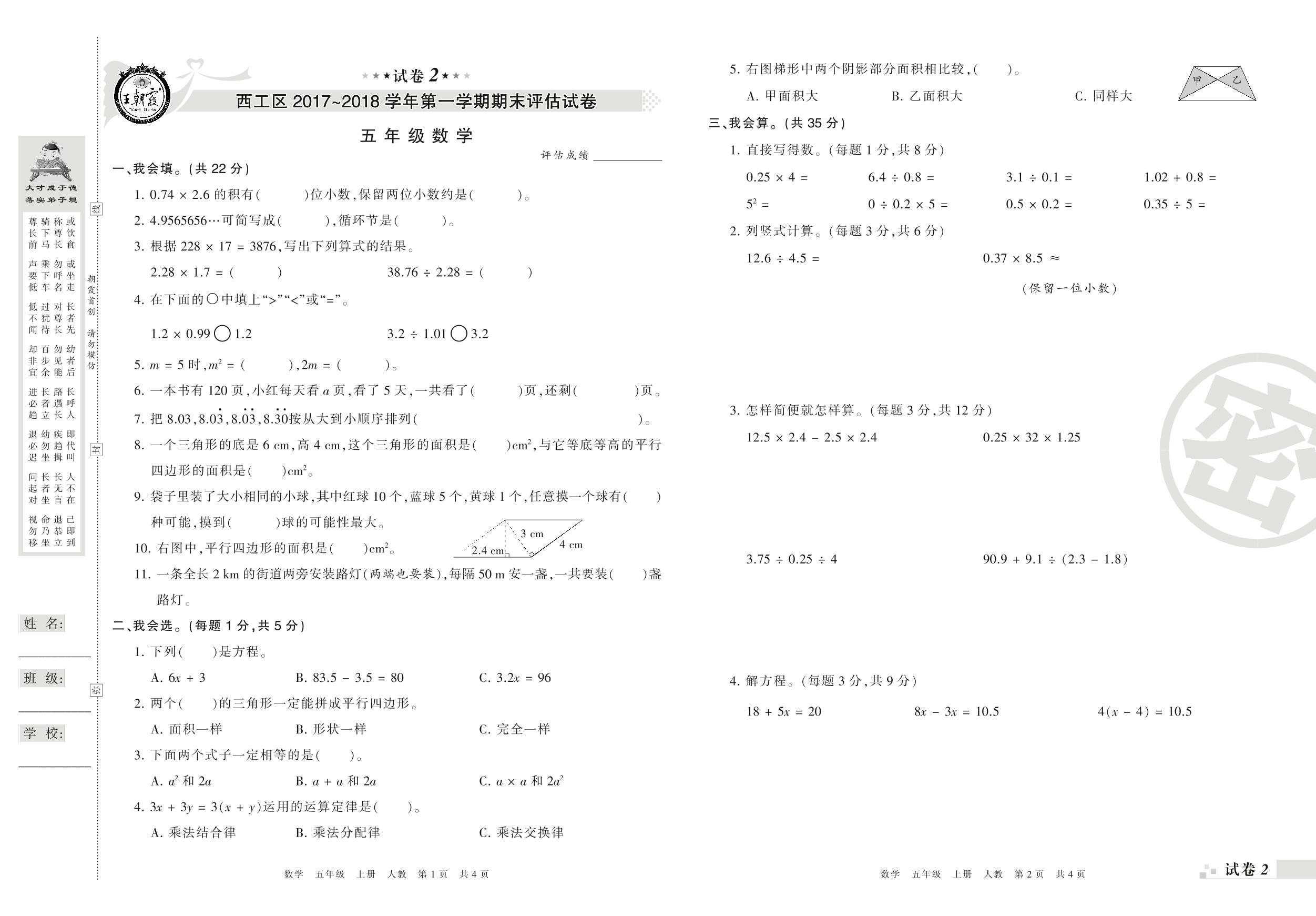 2017-2018学年第一学期洛阳市西工区五年级数学试卷(人教版)【2】