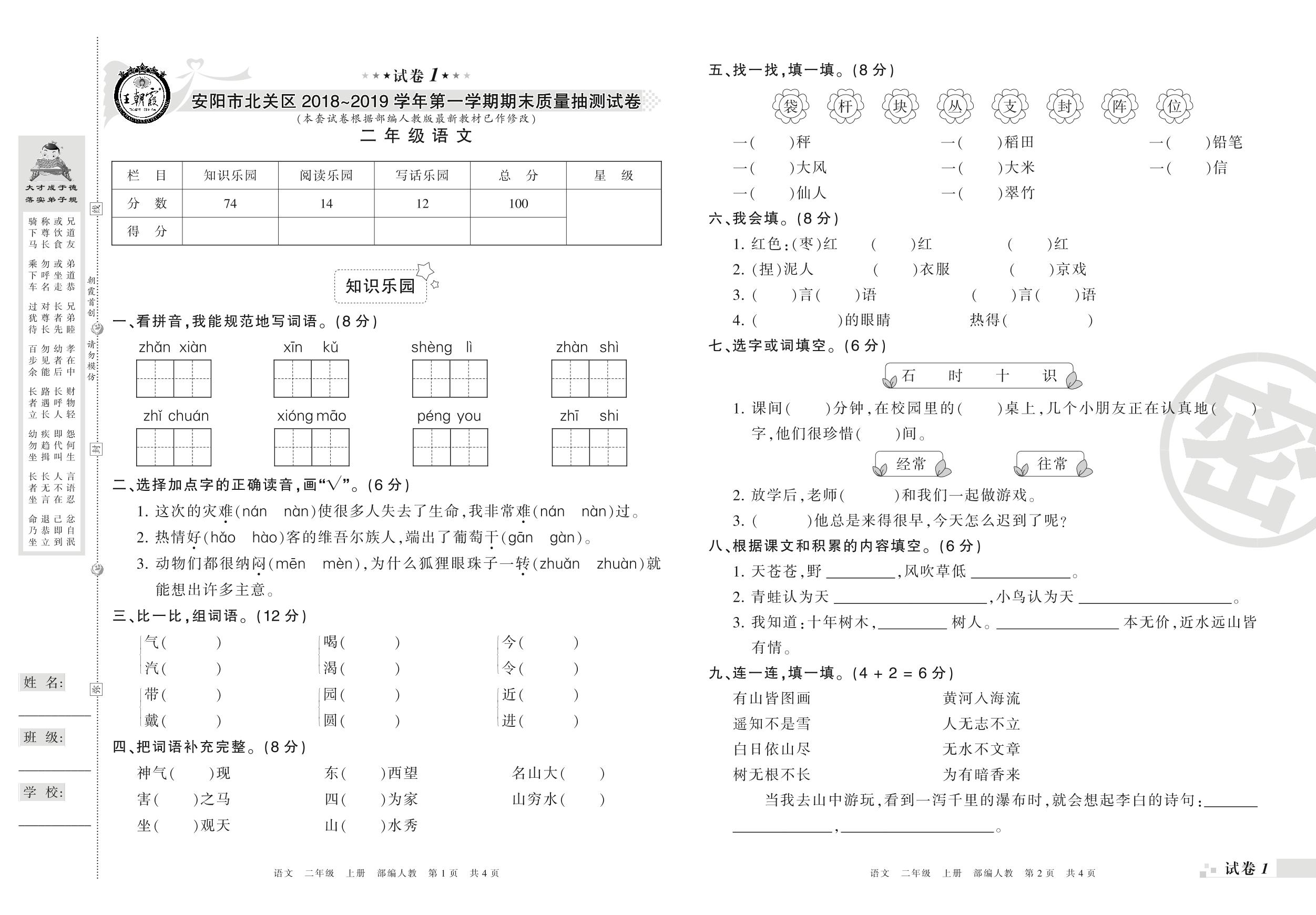 2018-2019学年第一学期安阳市北关区二年级语文试卷(人教版)【1】