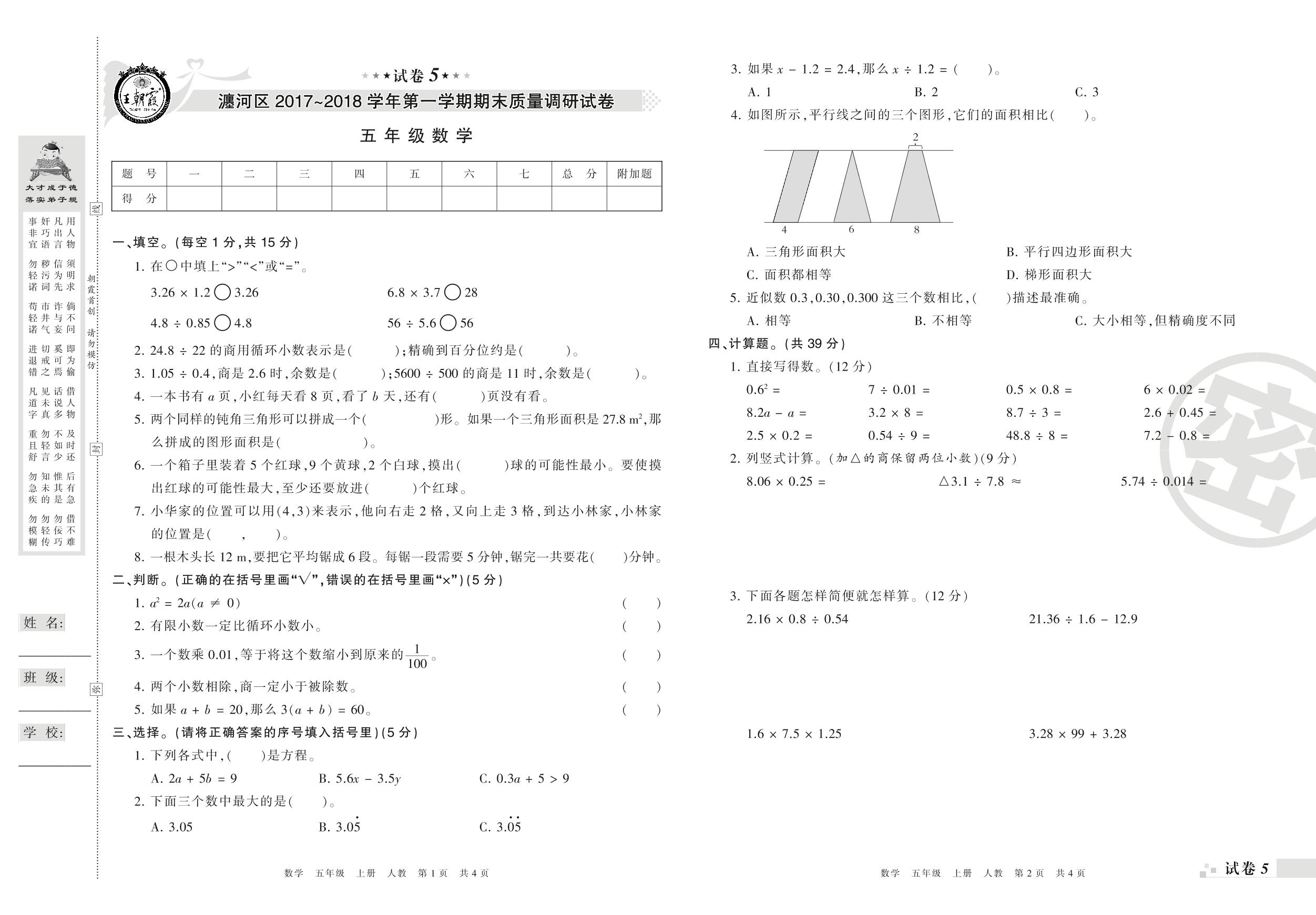2017-2018学年第一学期洛阳市瀍河区五年级数学试卷(人教版)【5】