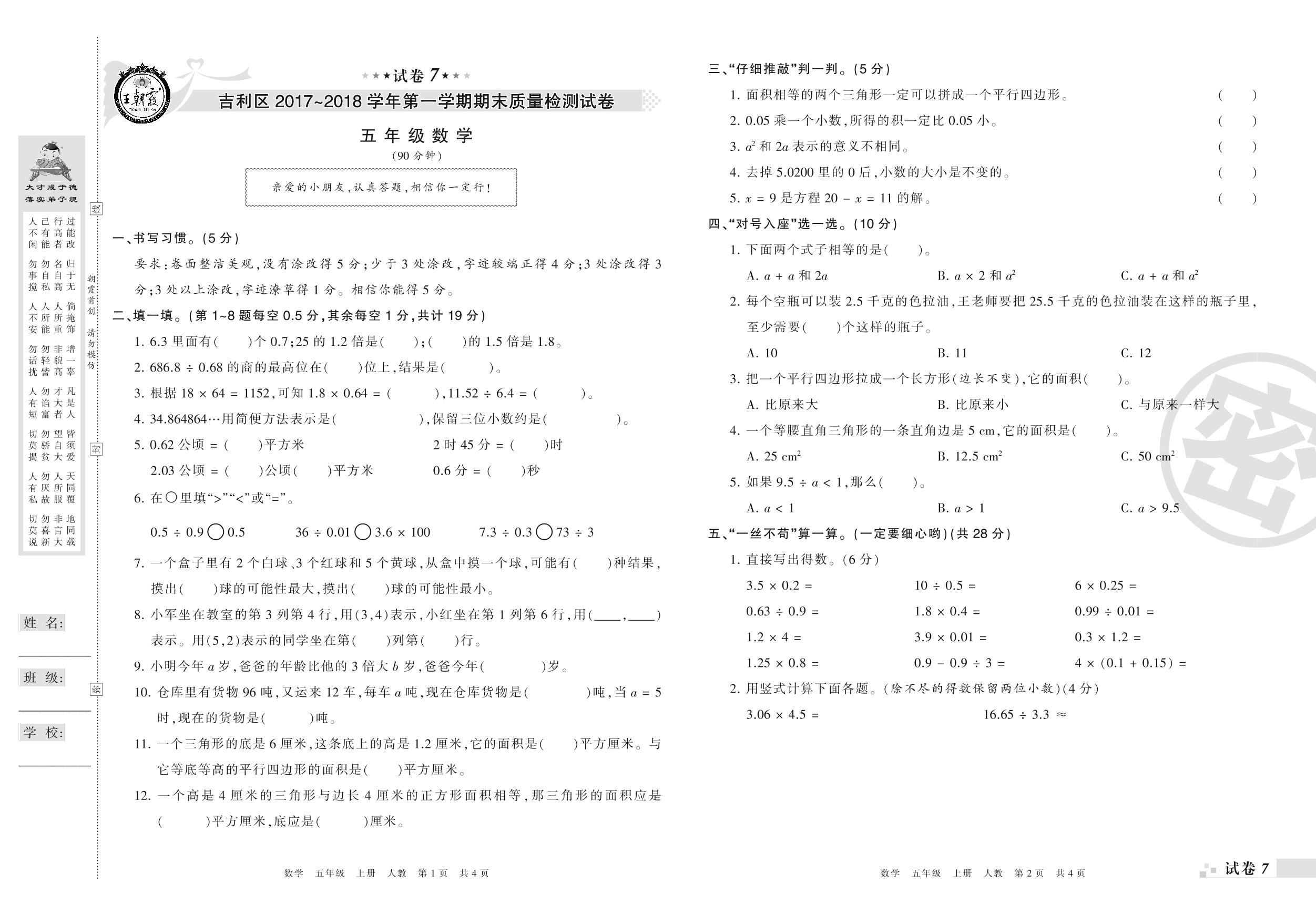 2017-2018学年第一学期洛阳市吉利区五年级数学试卷(人教版)【7】