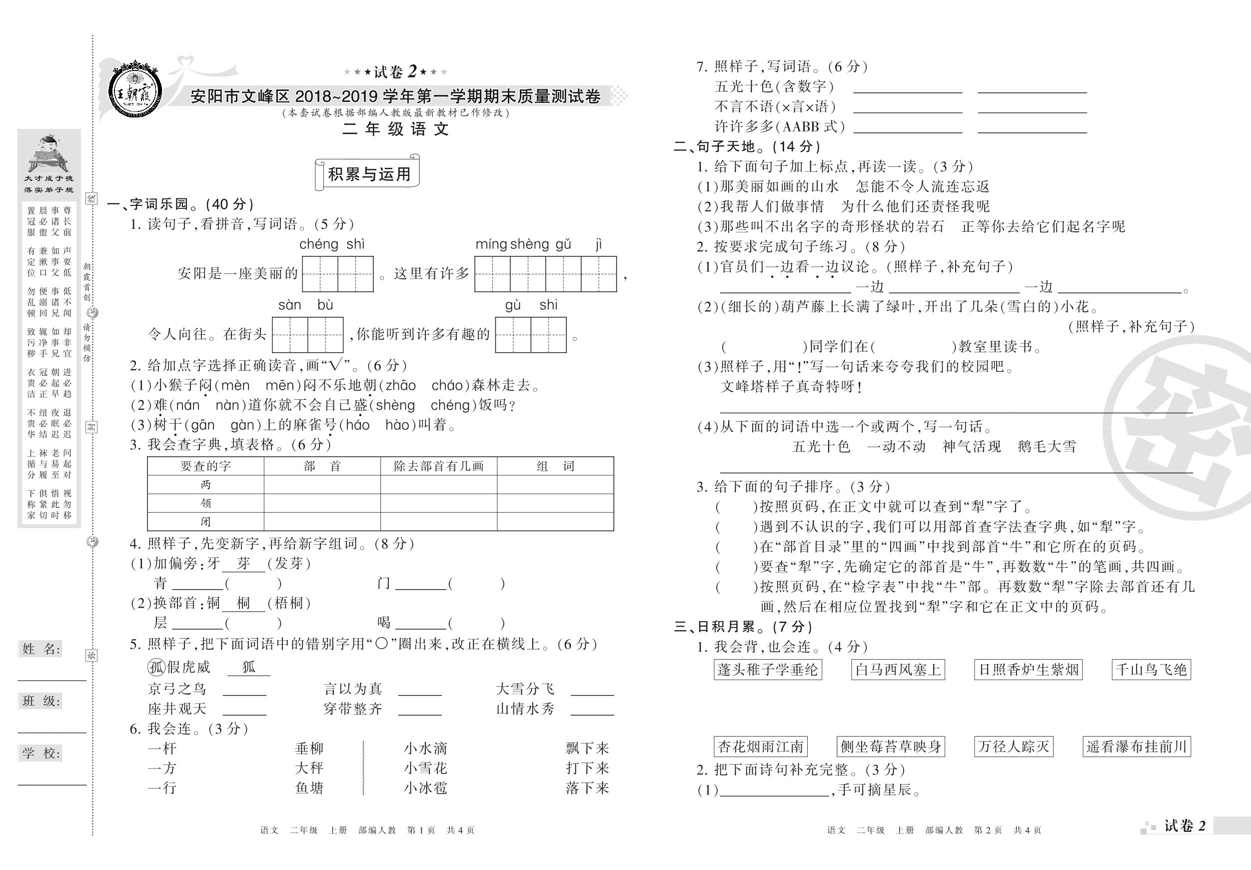 2018-2019学年第一学期安阳市文峰区二年级语文试卷(人教版)【2】
