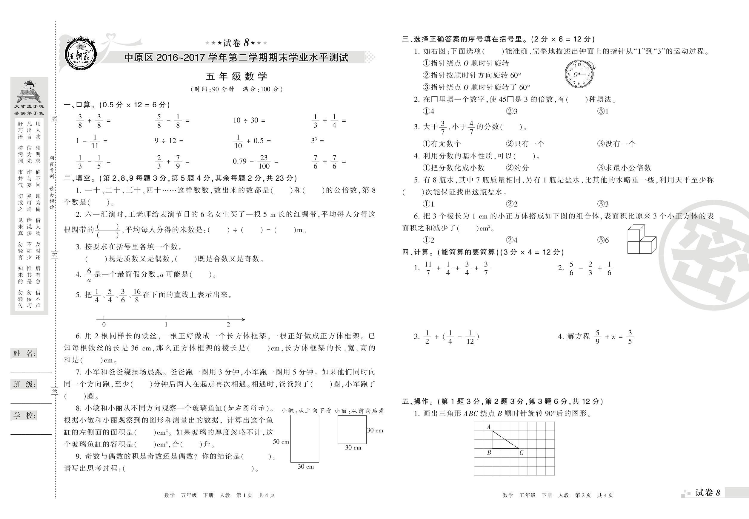 2016-2017学年第二学期中原区五年级数学试卷(人教版)【8】