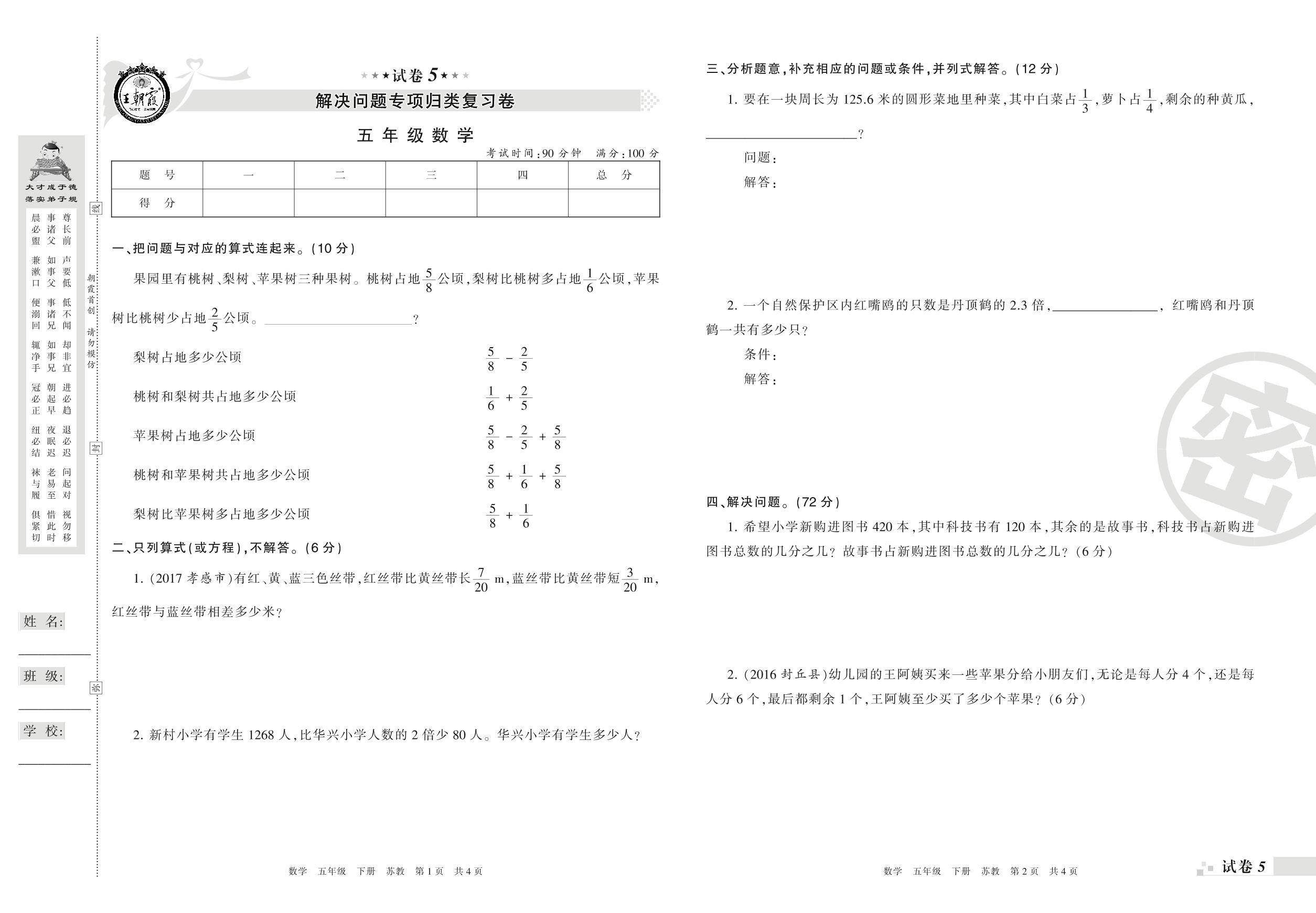 王朝霞期末专项卷——解决问题专项归类复习卷五年级下册数学(苏教版)【5】