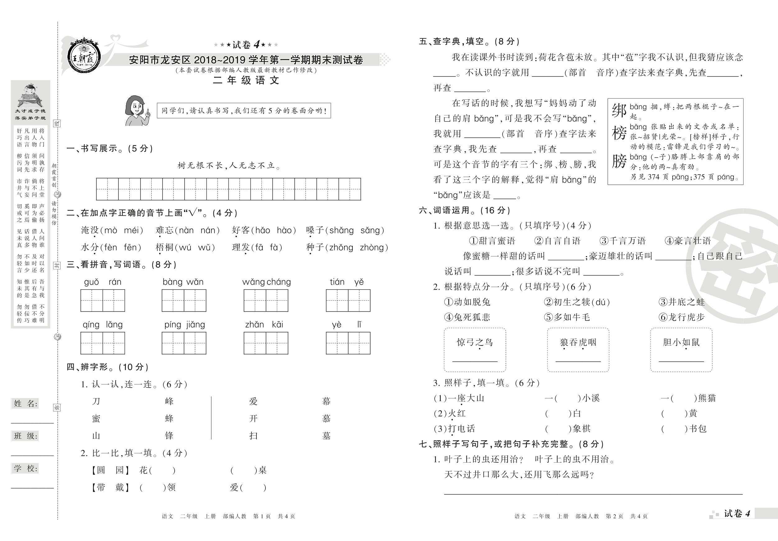 2018-2019学年第一学期安阳市龙安区二年级语文试卷(人教版)【4】