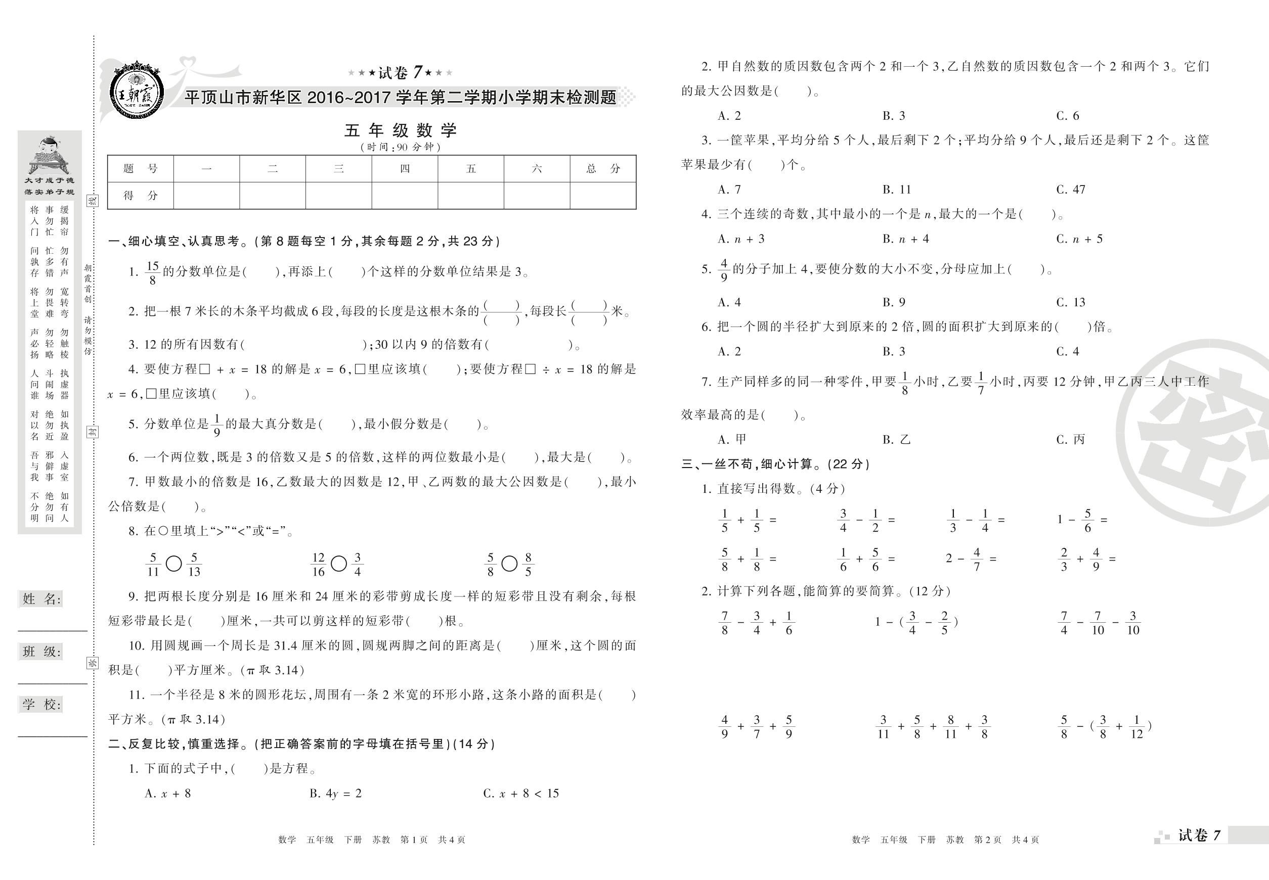 2016-2017学年第二学期平顶山市新华区五年级数学试卷(苏教版)【7】