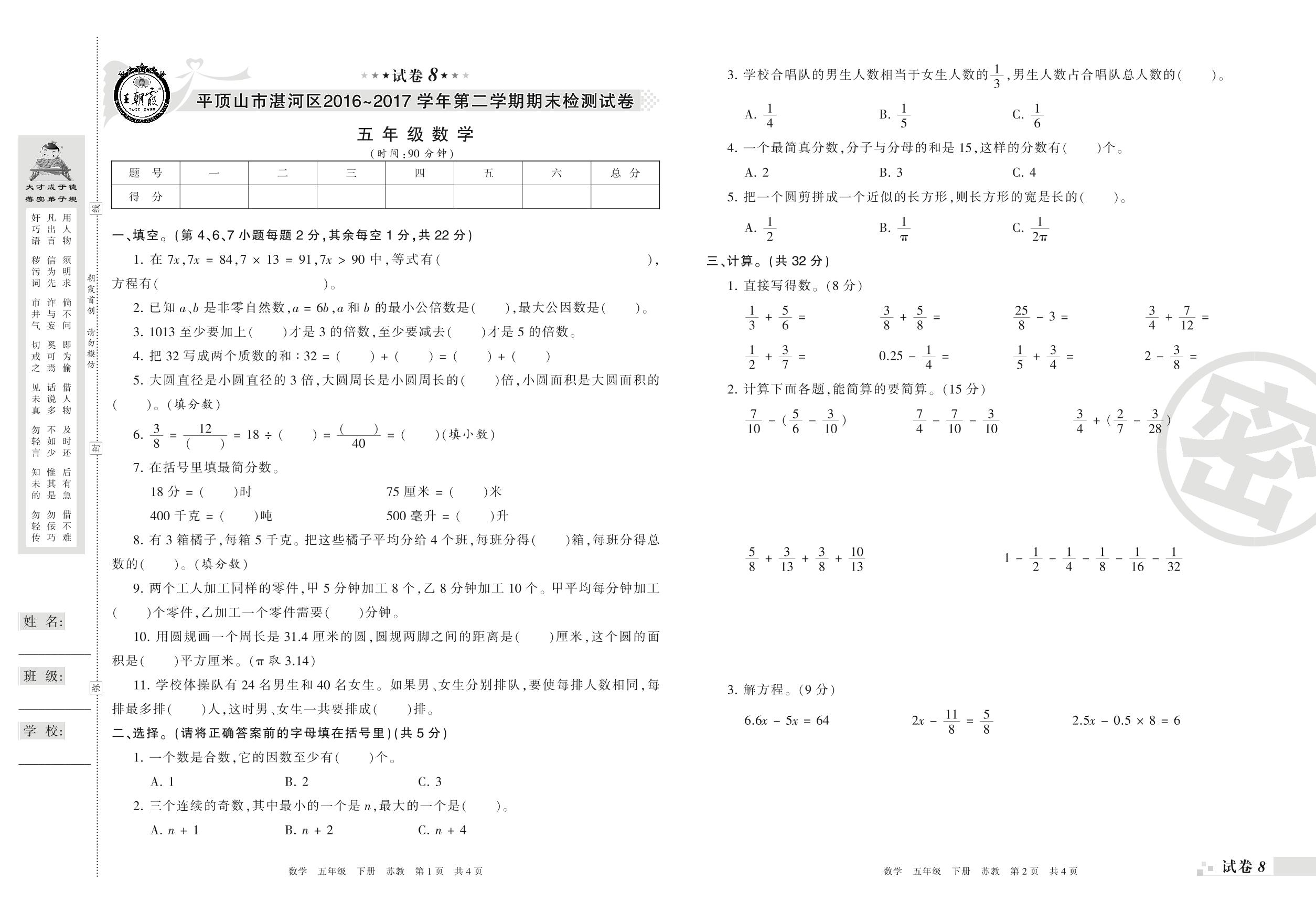 2016-2017学年第二学期平顶山市湛河区五年级数学试卷(苏教版)【8】
