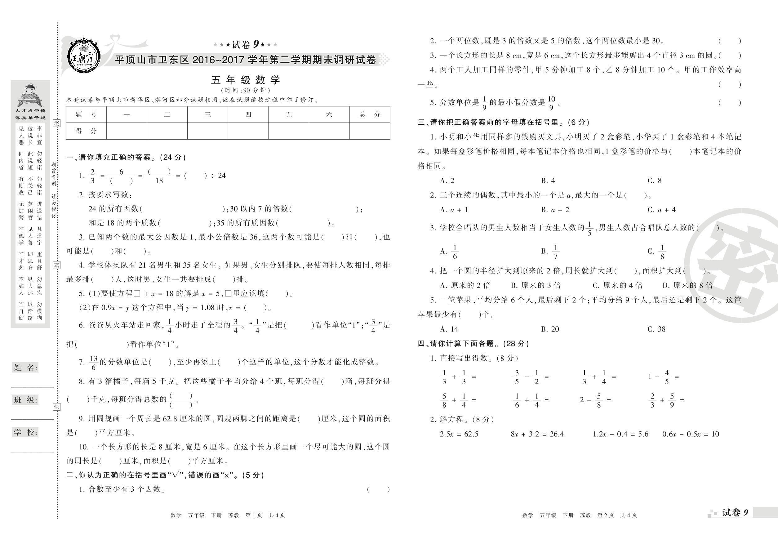 2016-2017学年第二学期平顶山市卫东区五年级数学试卷(苏教版)【9】