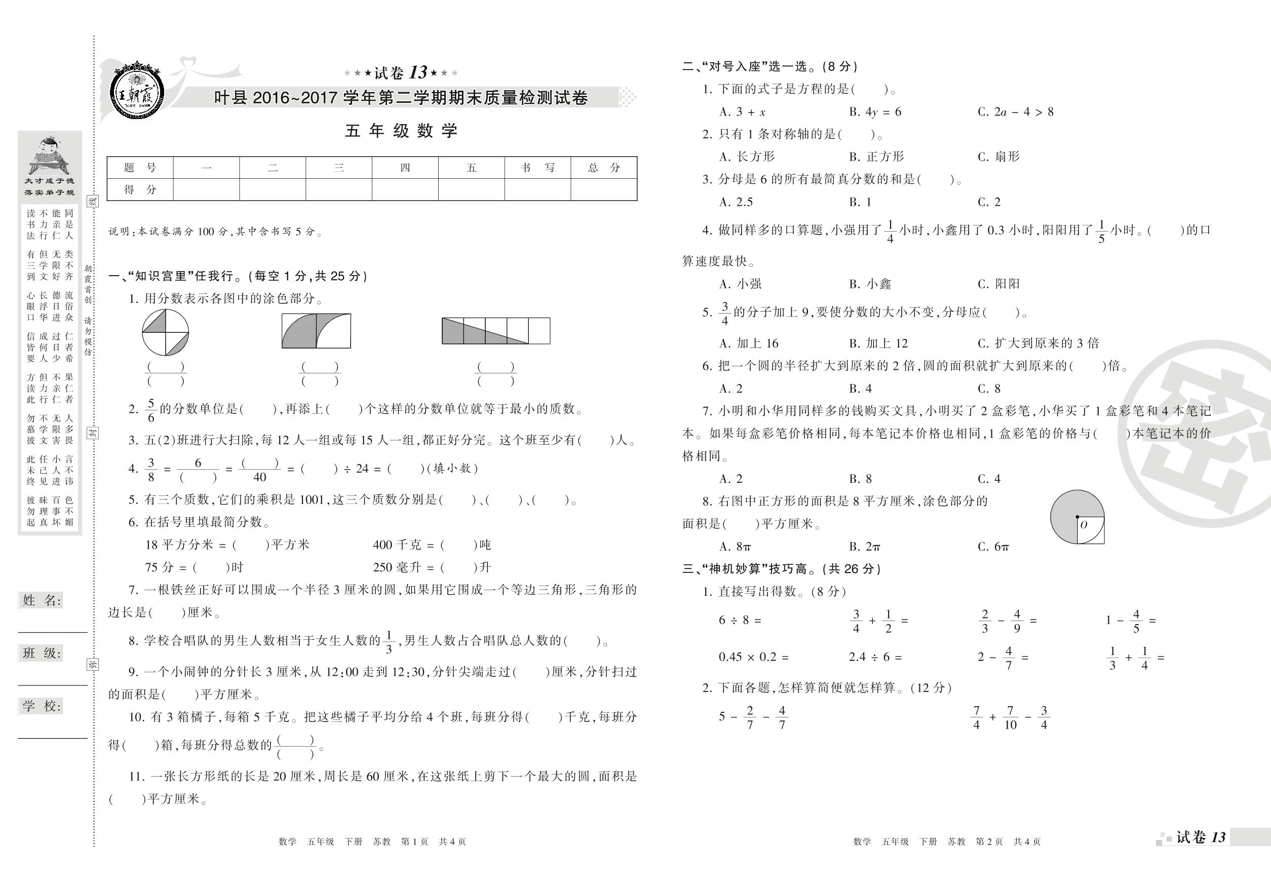 2016-2017学年第二学期平顶山市叶县五年级数学试卷(苏教版)【13】