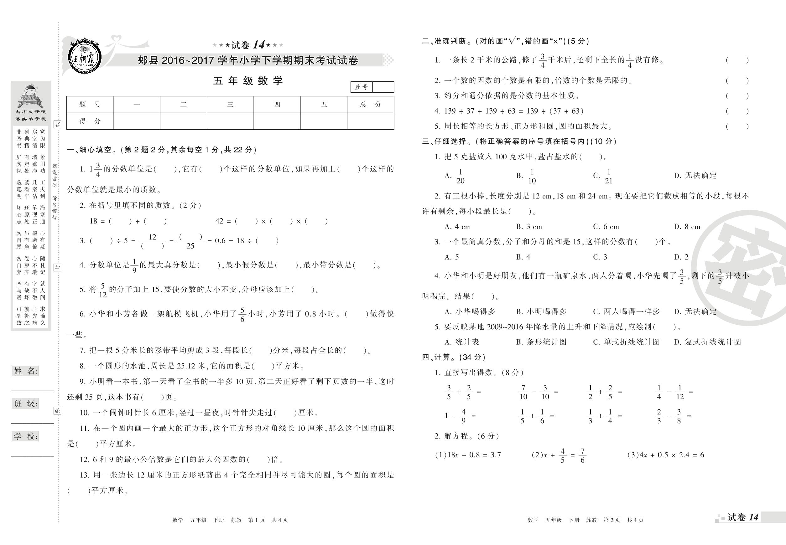 2016-2017学年第二学期平顶山市郏县五年级数学试卷(苏教版)【14】