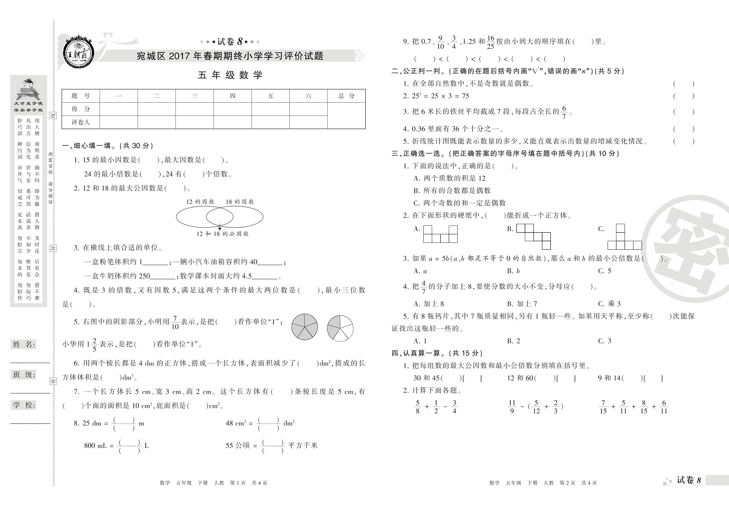 2016-2017学年第二学期南阳市宛城区五年级数学试卷(人教版)【8】