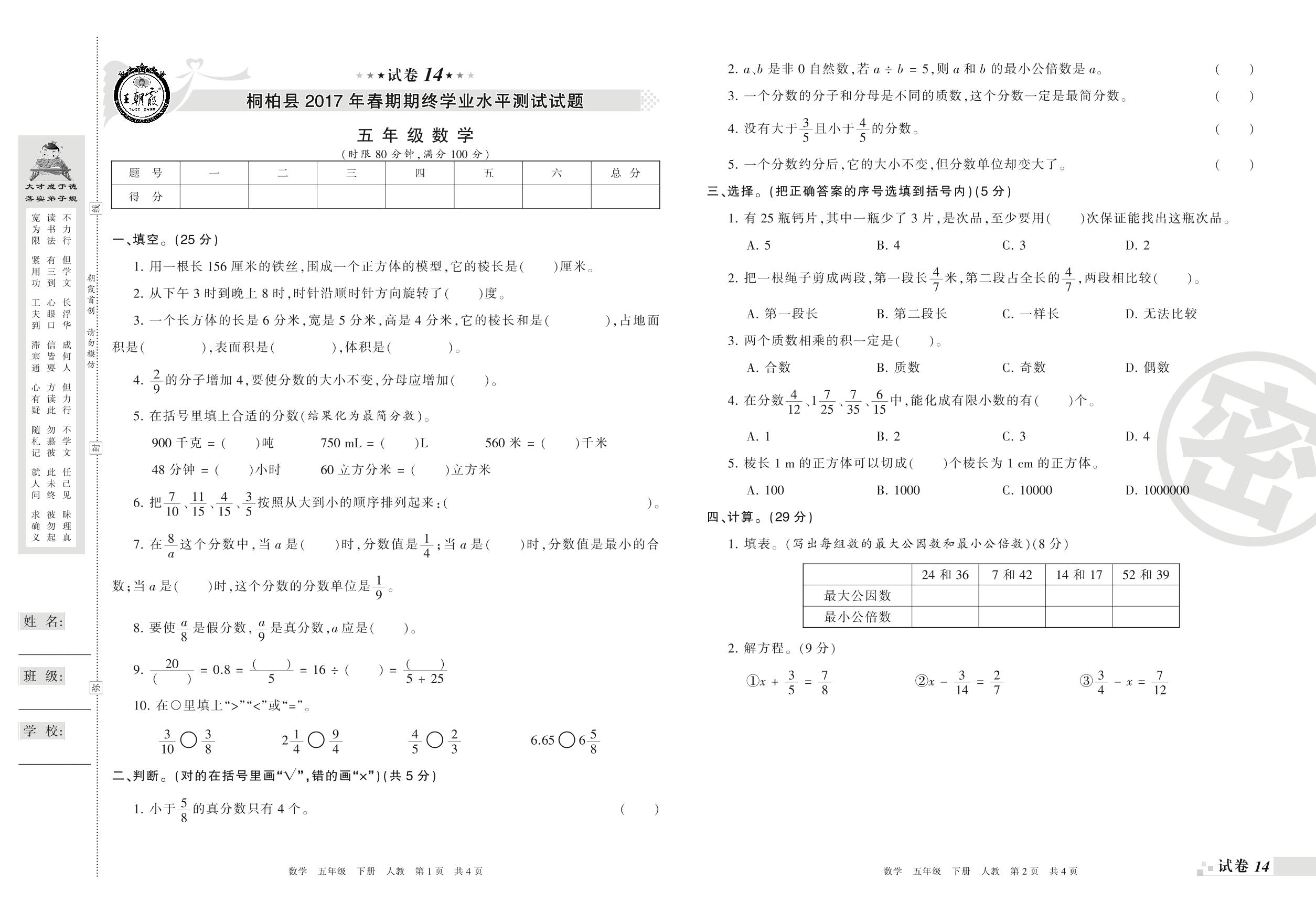 2016-2017学年第二学期南阳市桐柏县五年级数学试卷(人教版)【14】