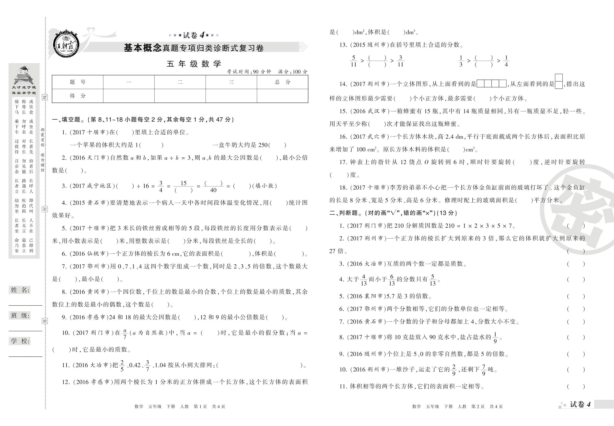 王朝霞期末专项卷——基本概念真题专项归类诊断式复习卷五年级下册数学(人教版)【4】