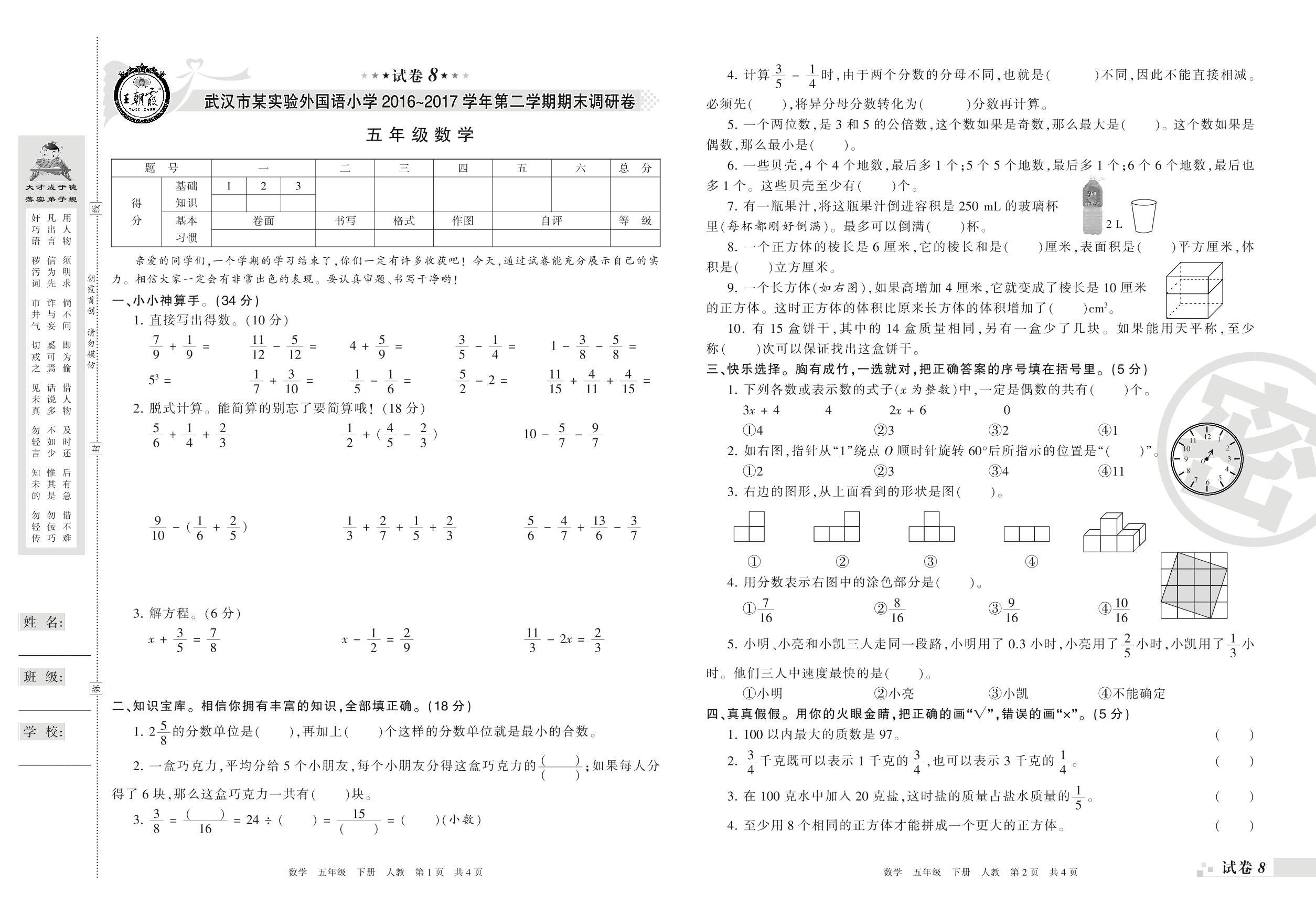 2016-2017学年第二学期武汉市五年级数学试卷(人教版)【8】