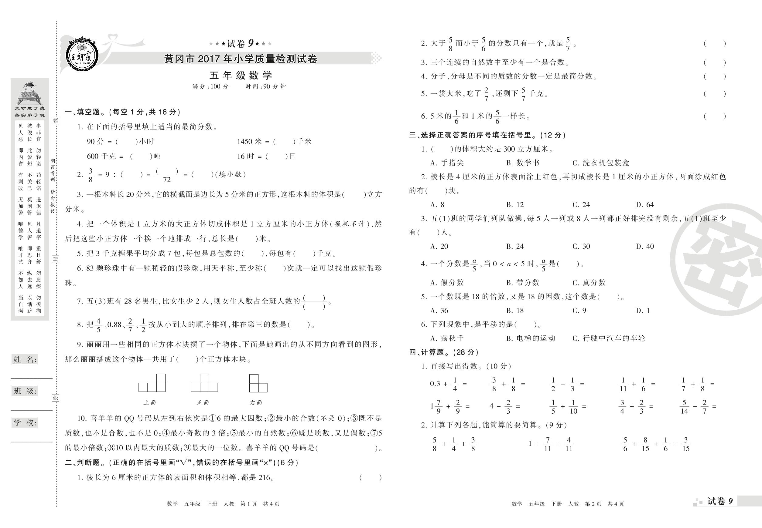 2016-2017学年第二学期黄冈市五年级数学试卷(人教版)【9】