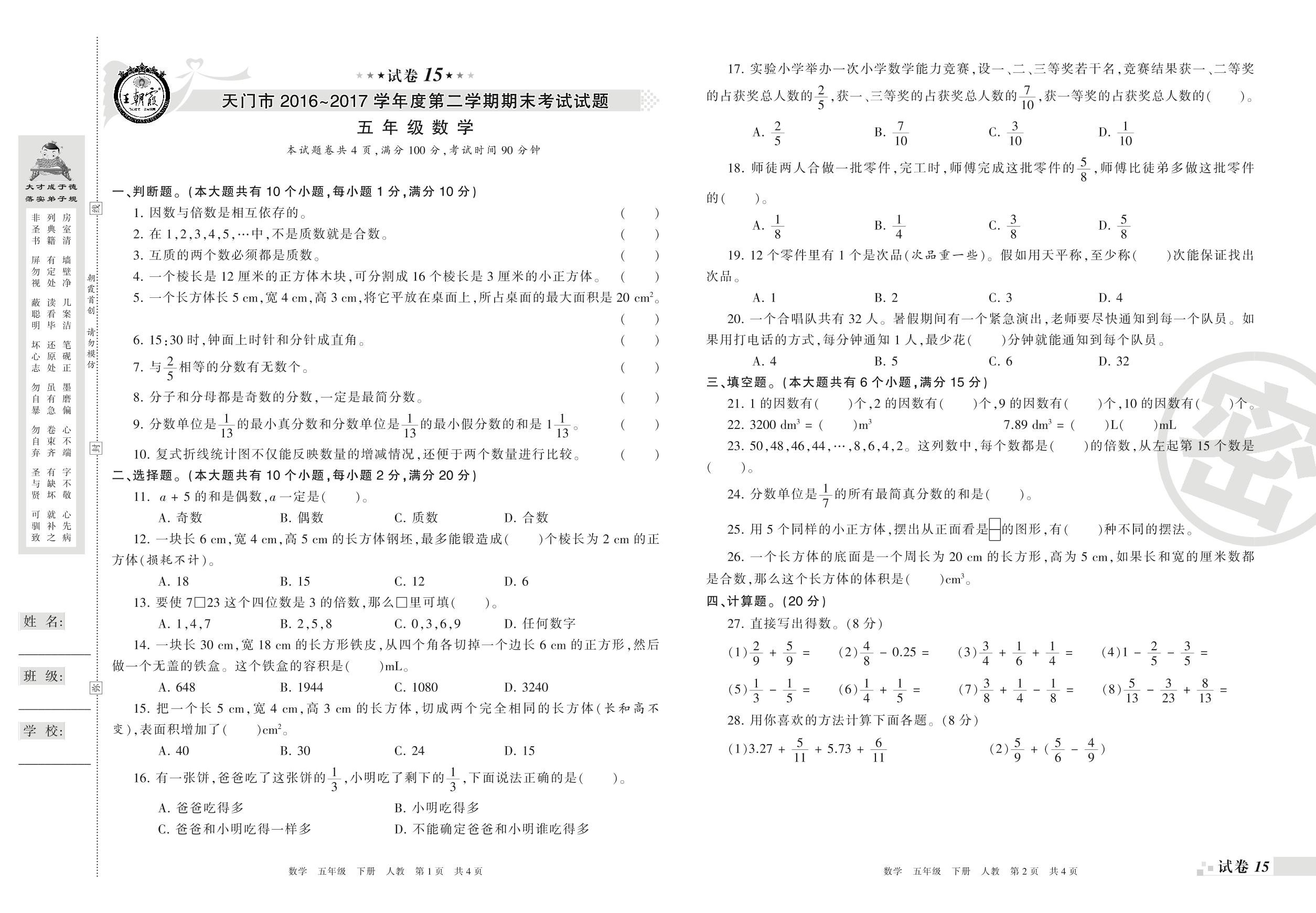 2016-2017学年第二学期天门市五年级数学试卷(人教版)【15】
