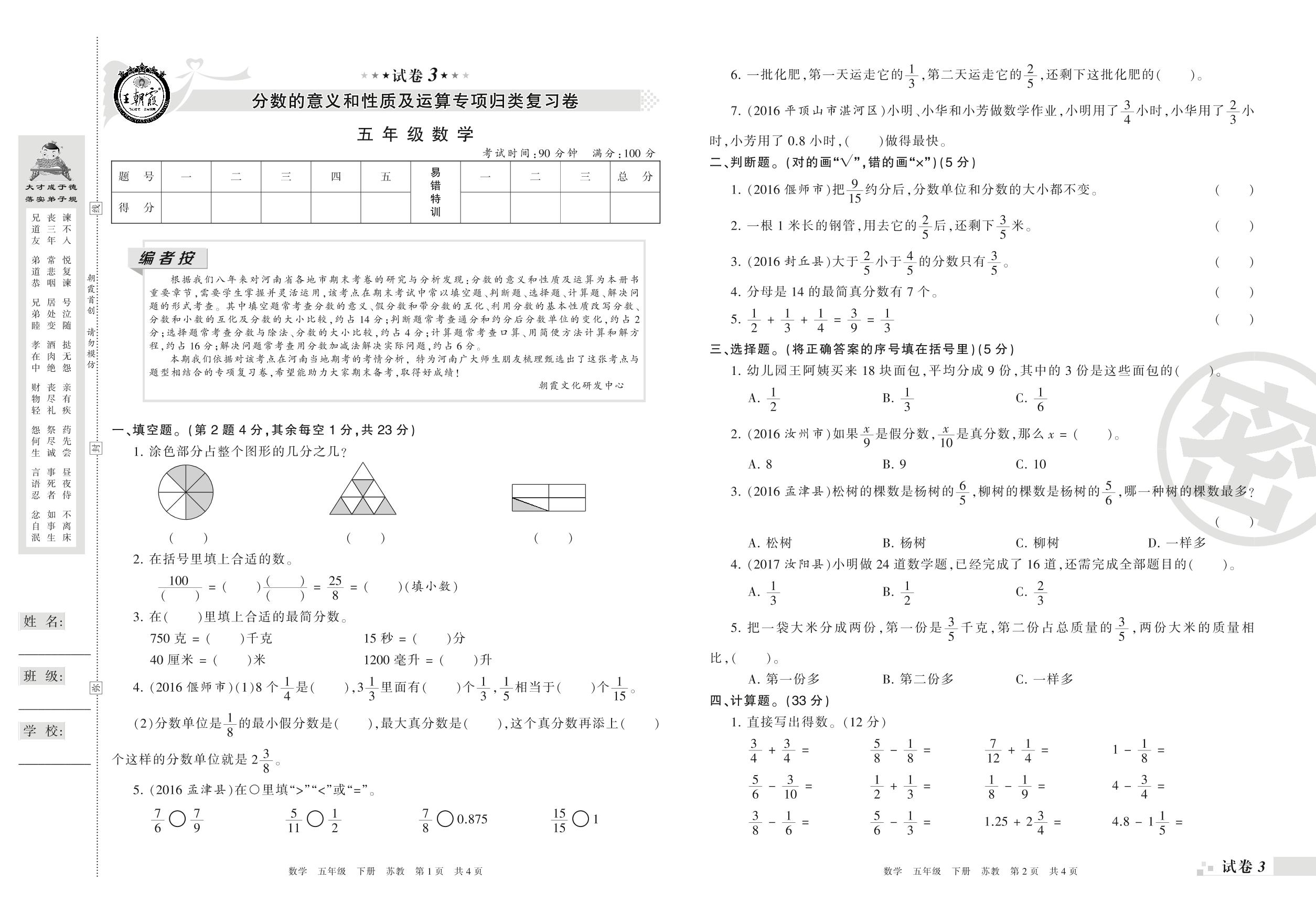 王朝霞期末专项卷——分数的意义和性质及运算专项归类复习卷五年级下册数学(苏教版)【3】
