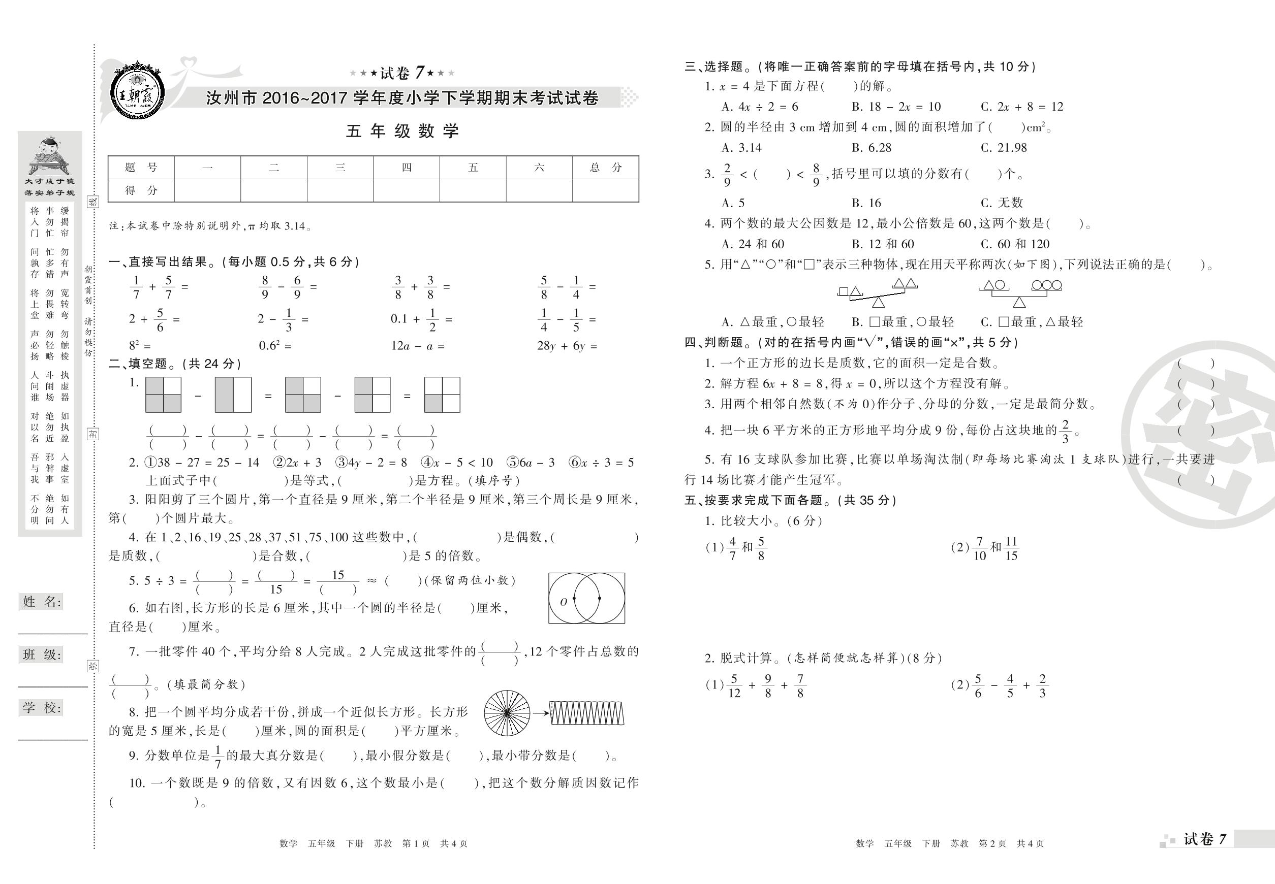2016-2017学年第二学期汝州市五年级数学试卷(苏教版)【7】