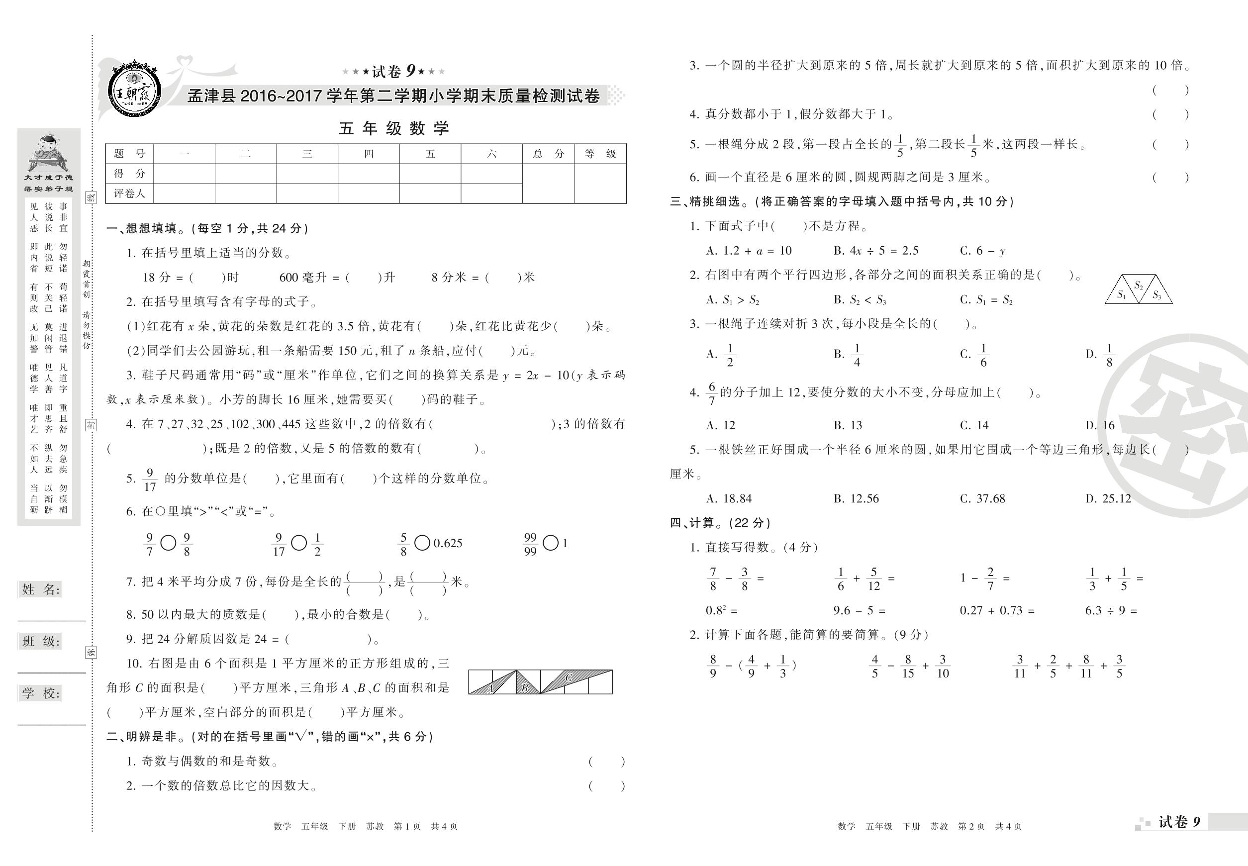 2016-2017学年第二学期洛阳市孟津县五年级数学试卷(苏教版)【9】