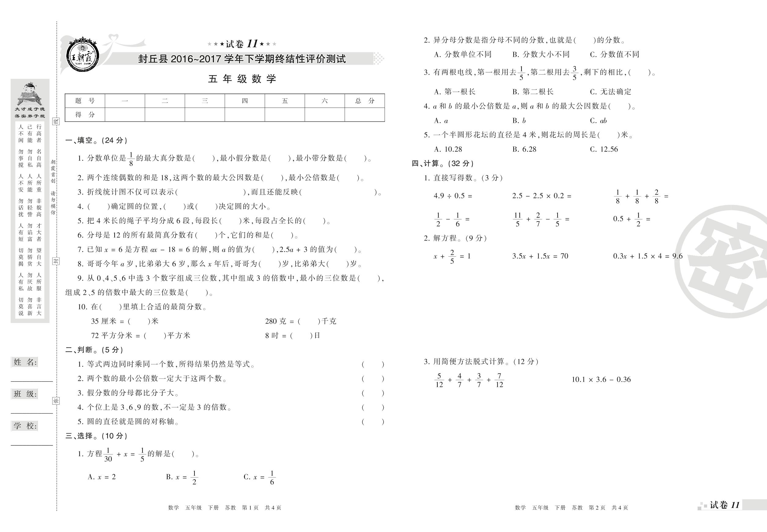 2016-2017学年第二学期新乡市封丘县五年级数学试卷(苏教版)【11】