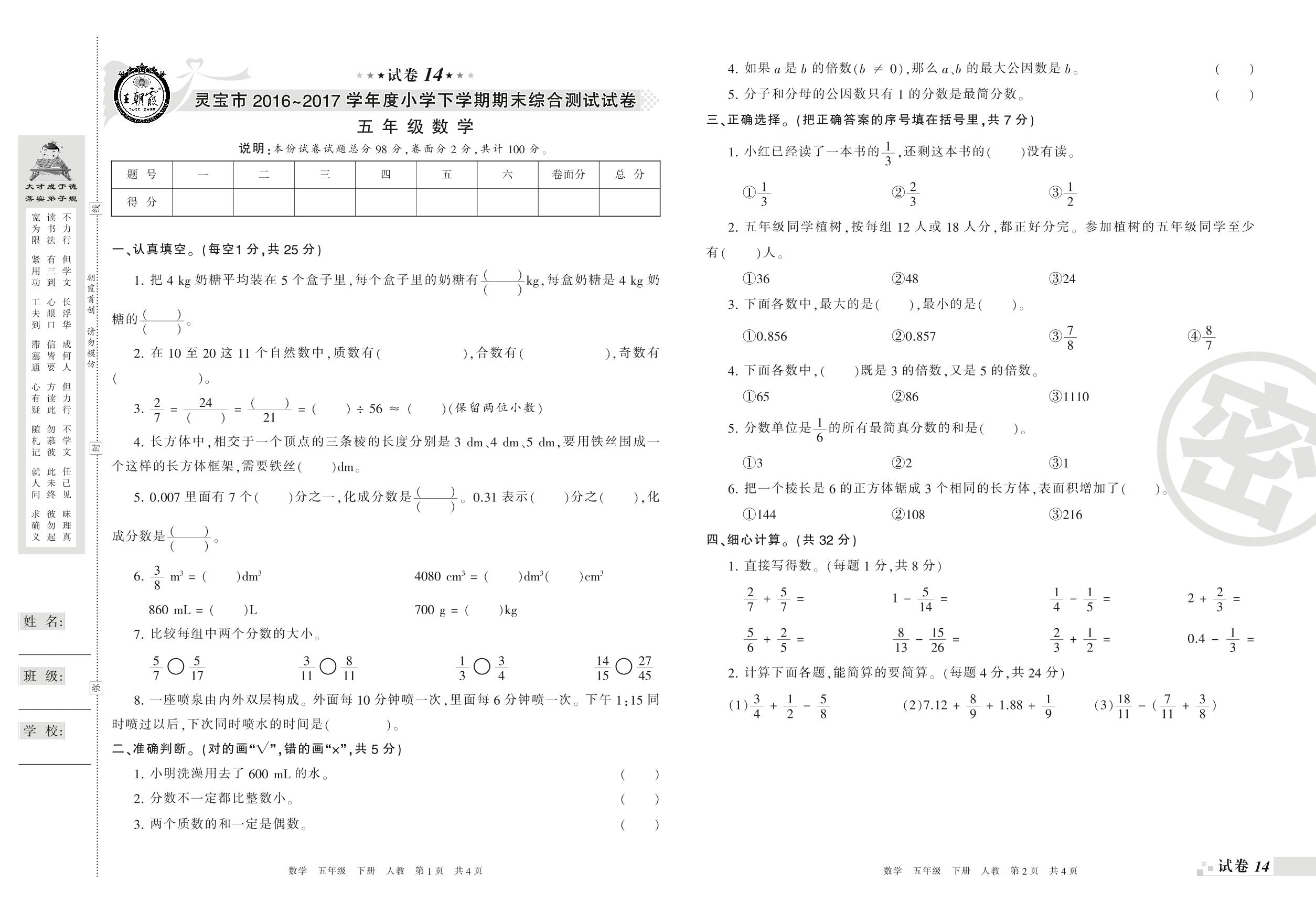 2016-2017学年第二学期灵宝市五年级数学试卷(人教版)【14】