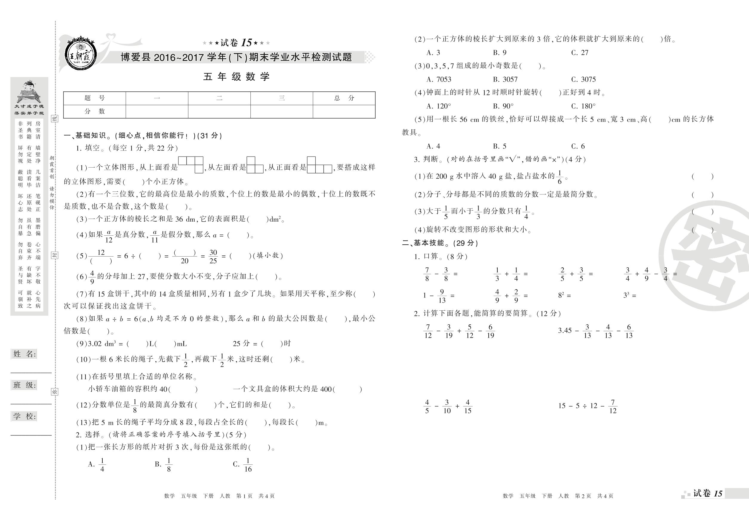 2016-2017学年第二学期焦作市博爱县五年级数学试卷(人教版)【15】