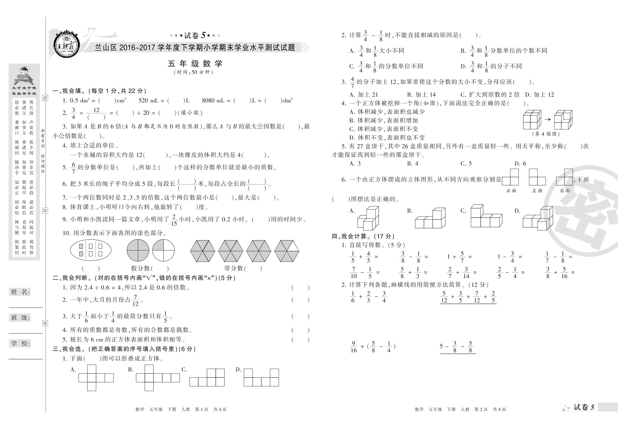 2016-2017学年第二学期临沂市兰山区五年级数学试卷(人教版)【5】