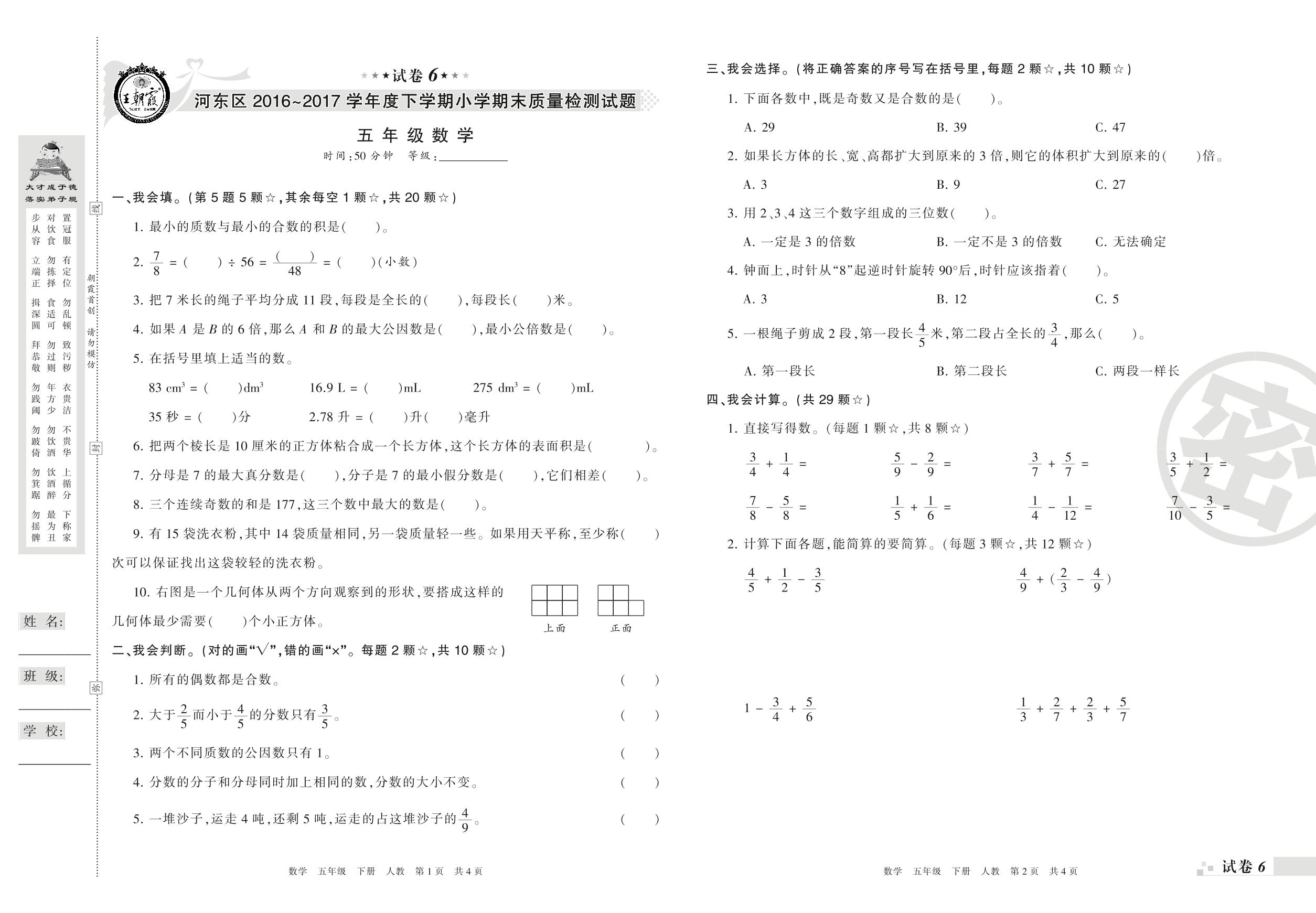 2016-2017学年第二学期临沂市河东区五年级数学试卷(人教版)【6】