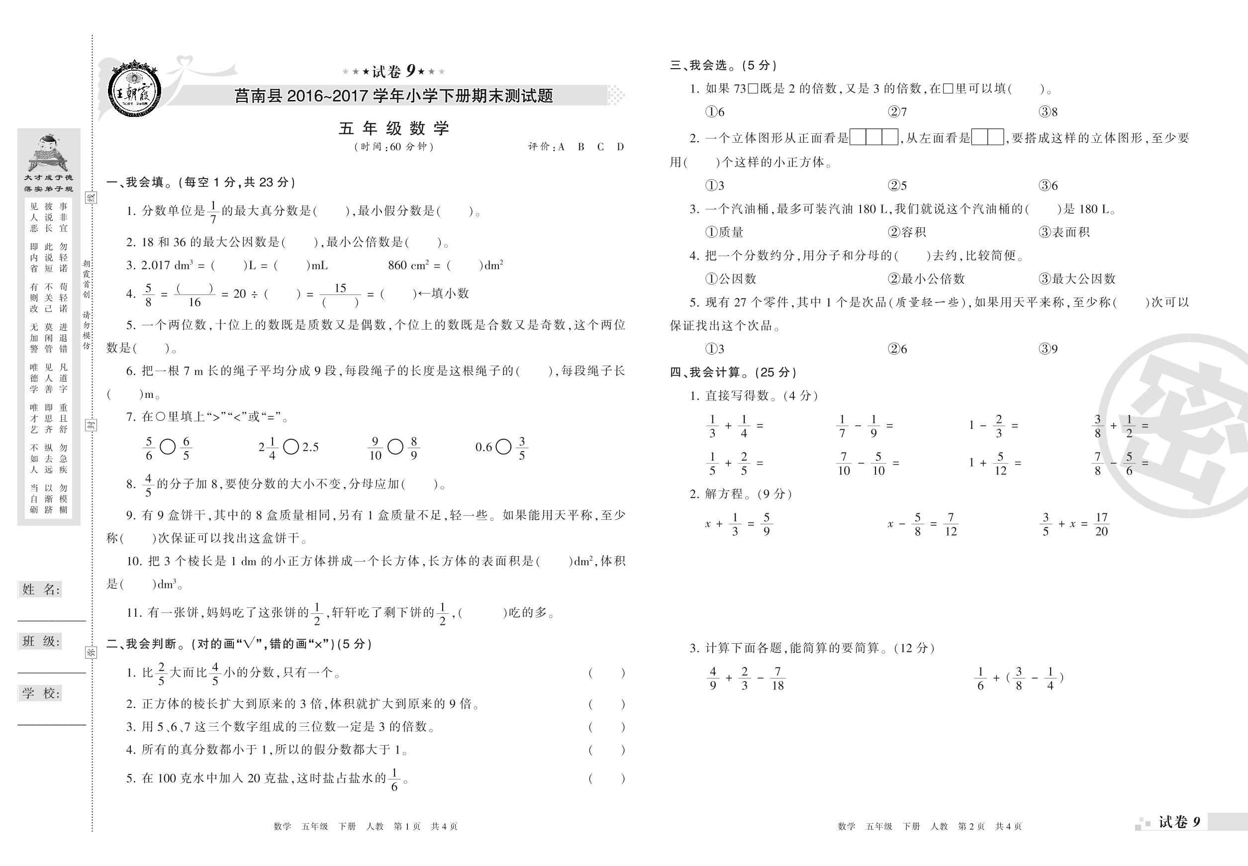2016-2017学年第二学期临沂市莒南县五年级数学试卷(人教版)【9】