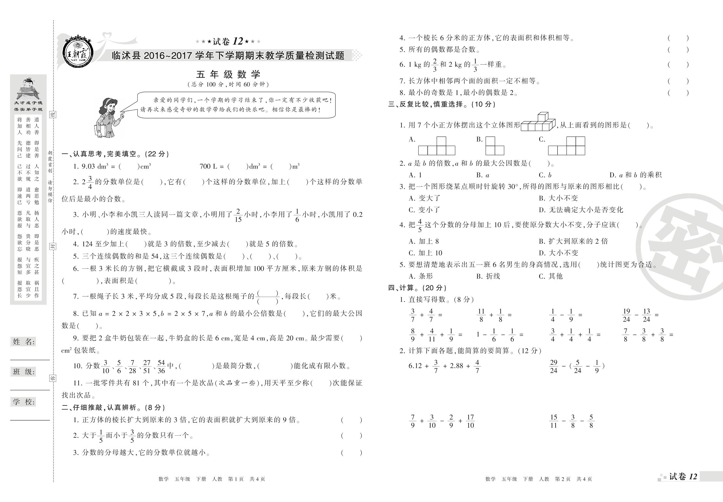 2016-2017学年第二学期临沂市临沭县五年级数学试卷(人教版)【12】