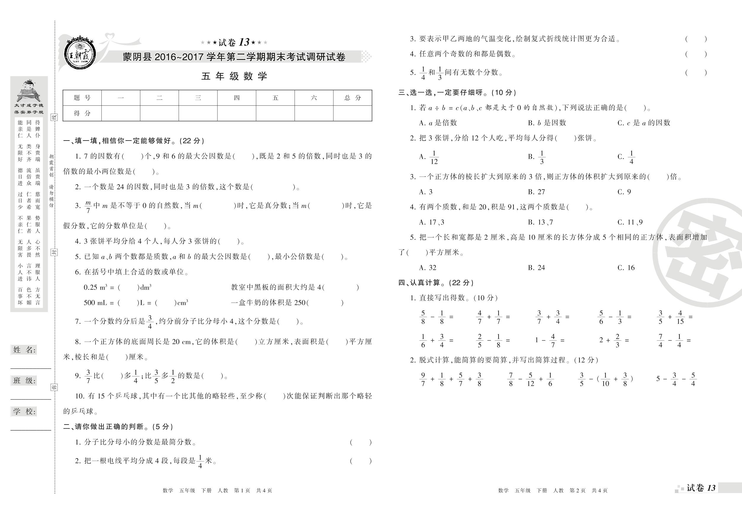 2016-2017学年第二学期临沂市蒙阴县五年级数学试卷(人教版)【13】