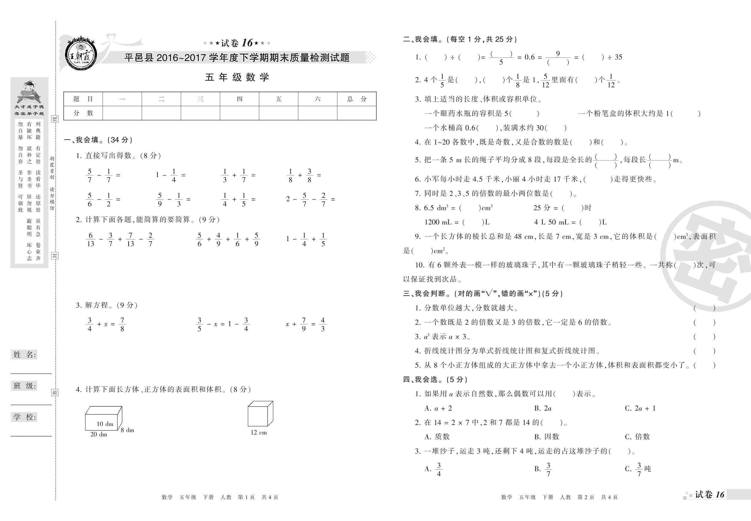 2016-2017学年第二学期临沂市平邑县五年级数学试卷(人教版)【16】