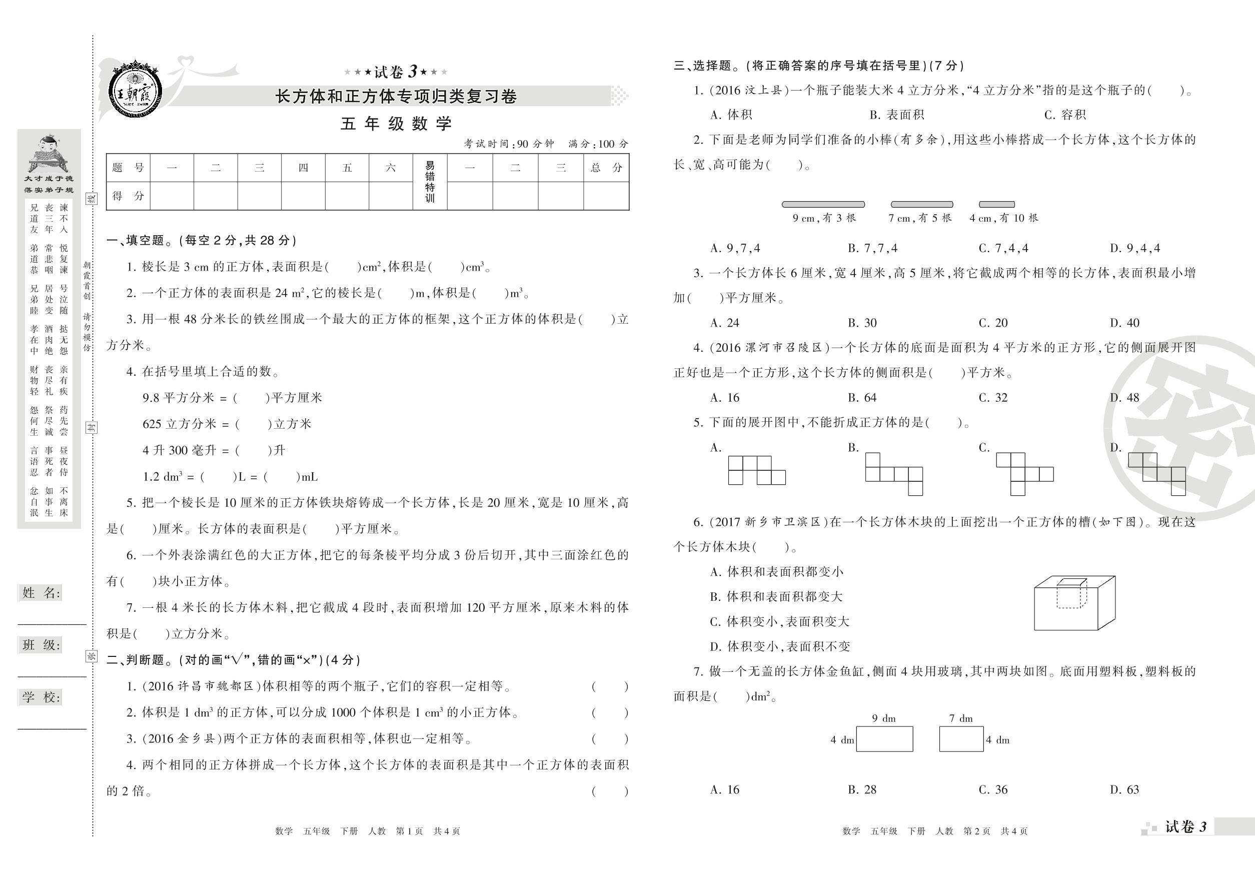 王朝霞期末专项卷——长方体和正方体专项归类复习卷五年级下册数学(人教版)_R220125151918309【3】