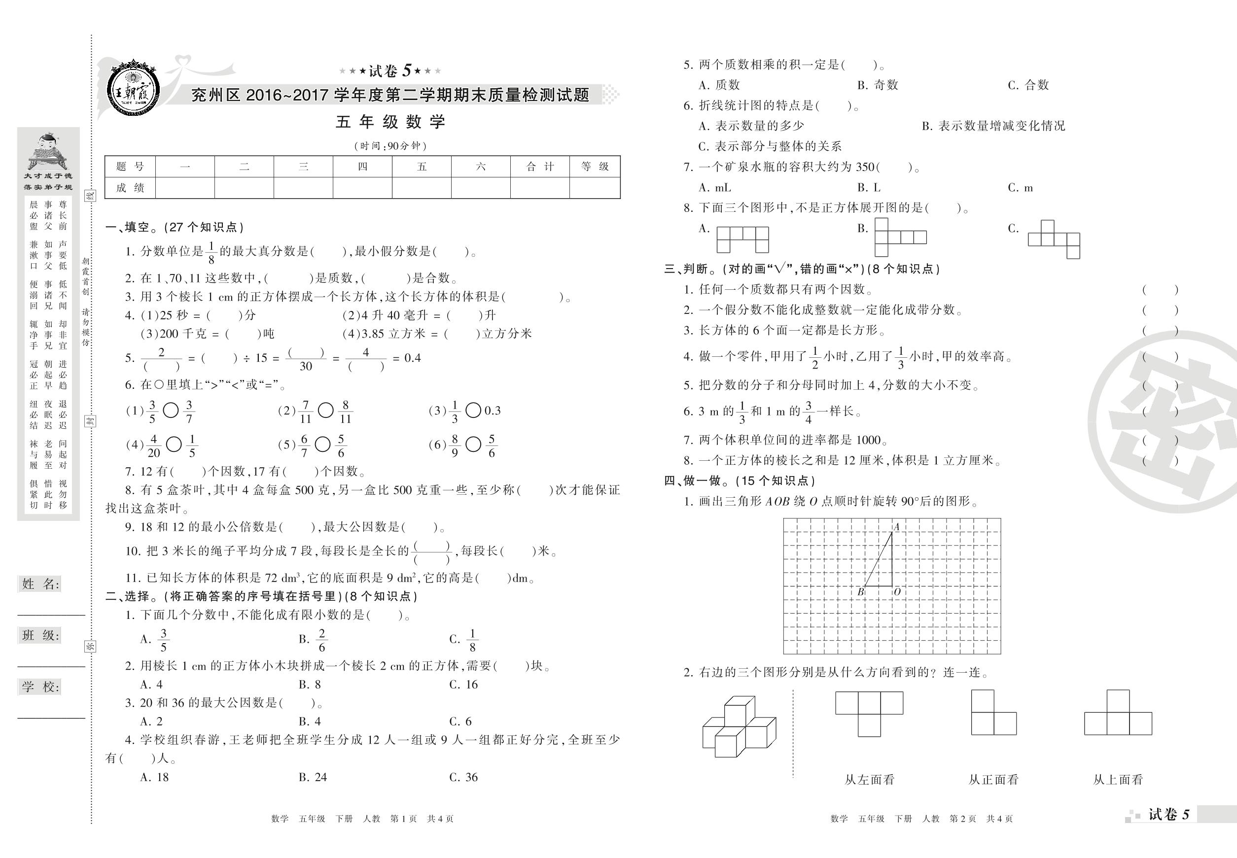 2016-2017学年第二学期济宁市兖州区五年级数学试卷(人教版)【5】