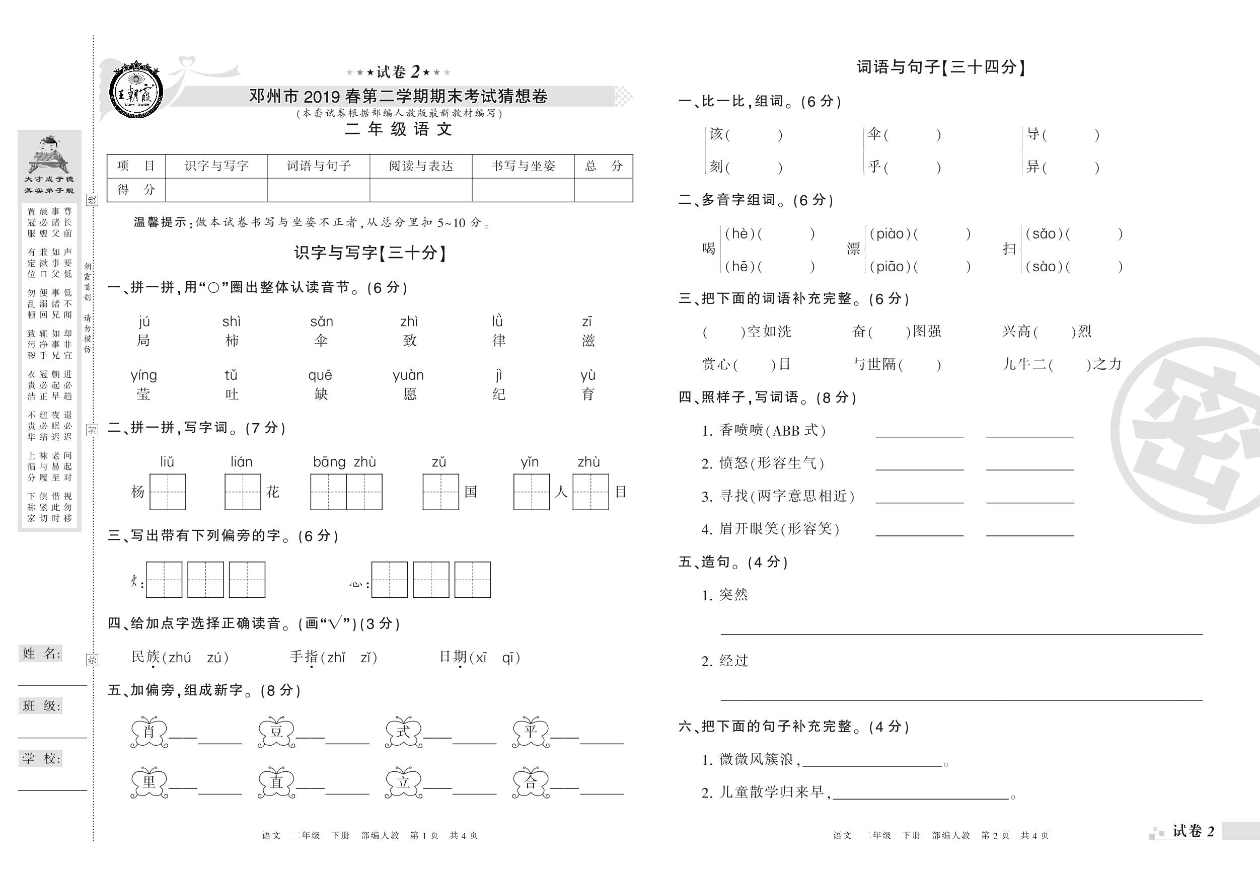 2017-2018学年第二学期邓州市二年级语文试卷(人教版)【2】