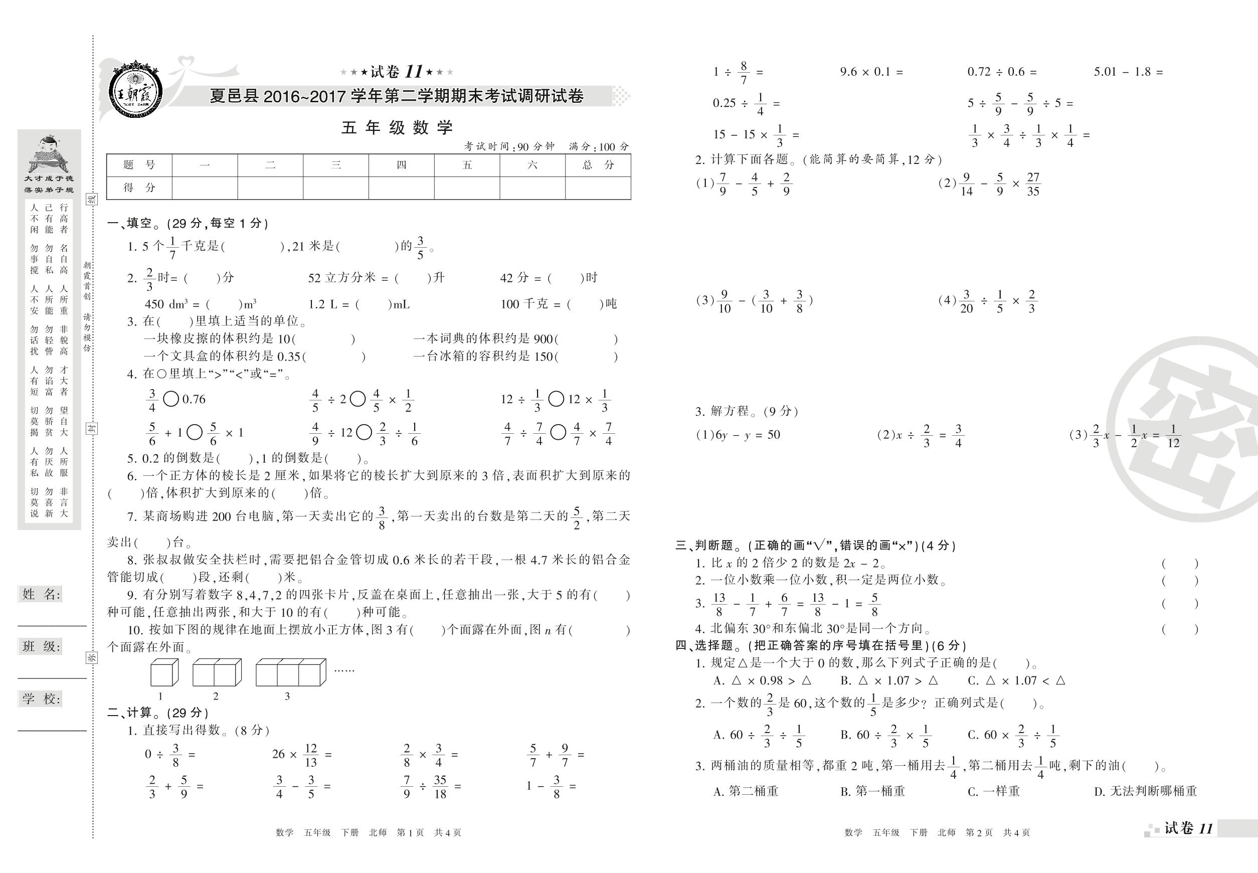 2016-2017学年第二学期商丘市夏邑县五年级数学试卷(北师版)【11】