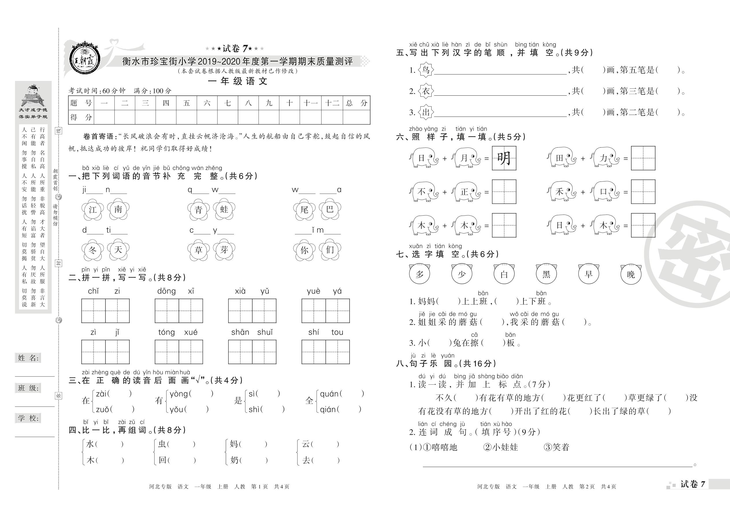 2019-2020学年第一学期衡水市珍宝街小学一年级语文试卷(人教版)【7】