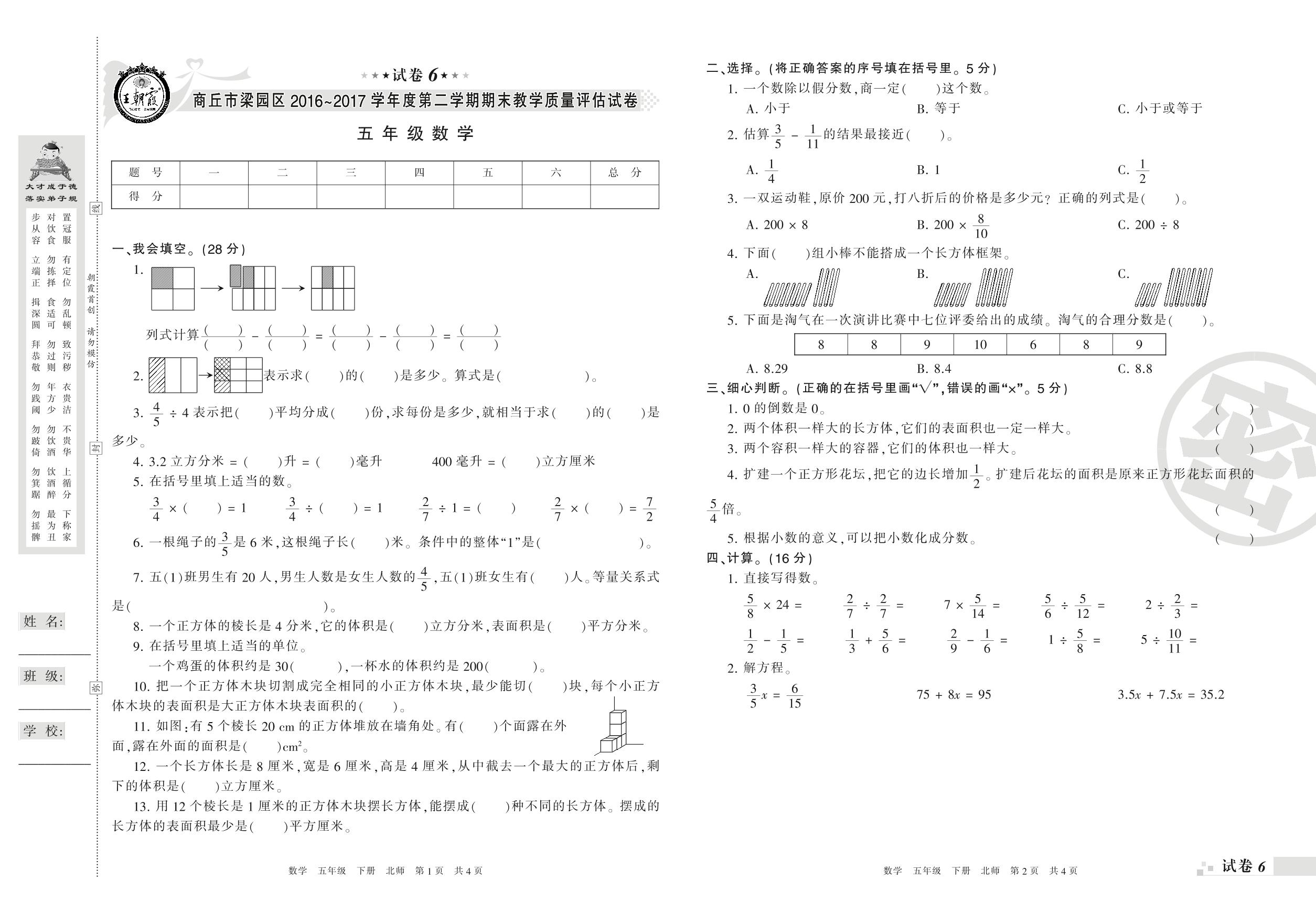 2016-2017学年第二学期商丘市梁园区五年级数学试卷(北师版)【6】