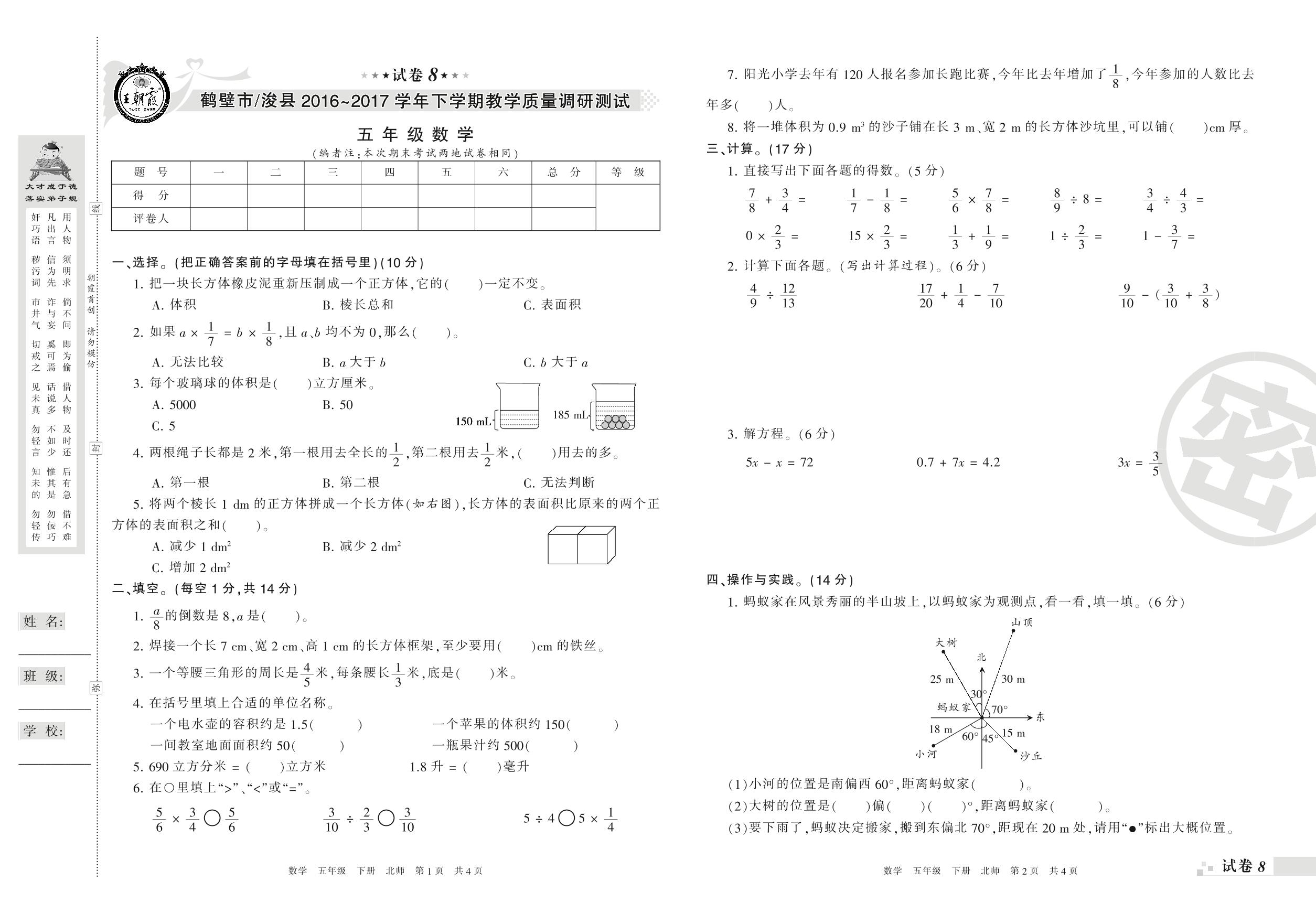 2016-2017学年第二学期鹤壁市、浚县五年级数学试卷(北师版)【8】