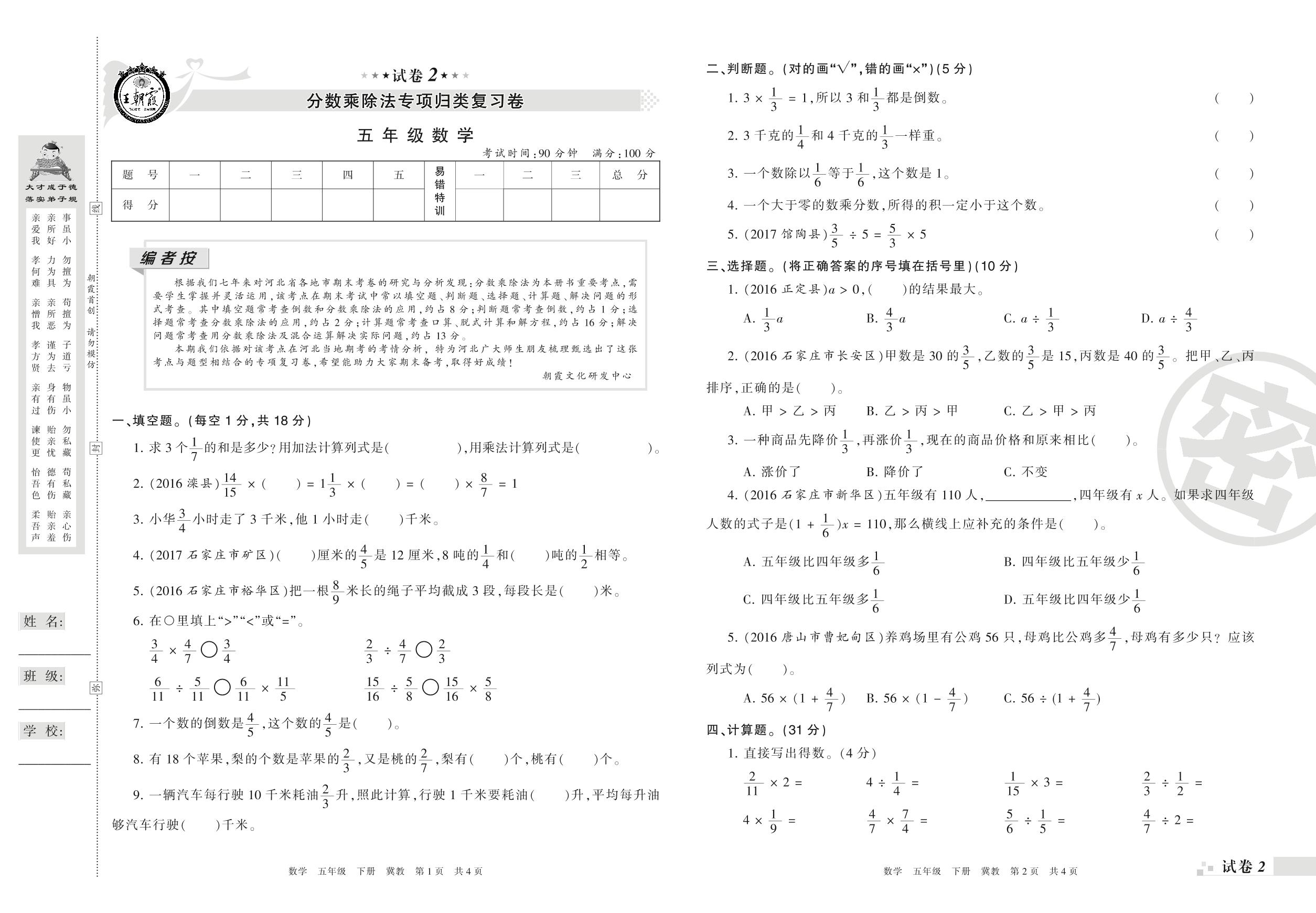 王朝霞期末专项卷——分数乘除法专项归类复习卷五年级下册数学(冀教版)【2】