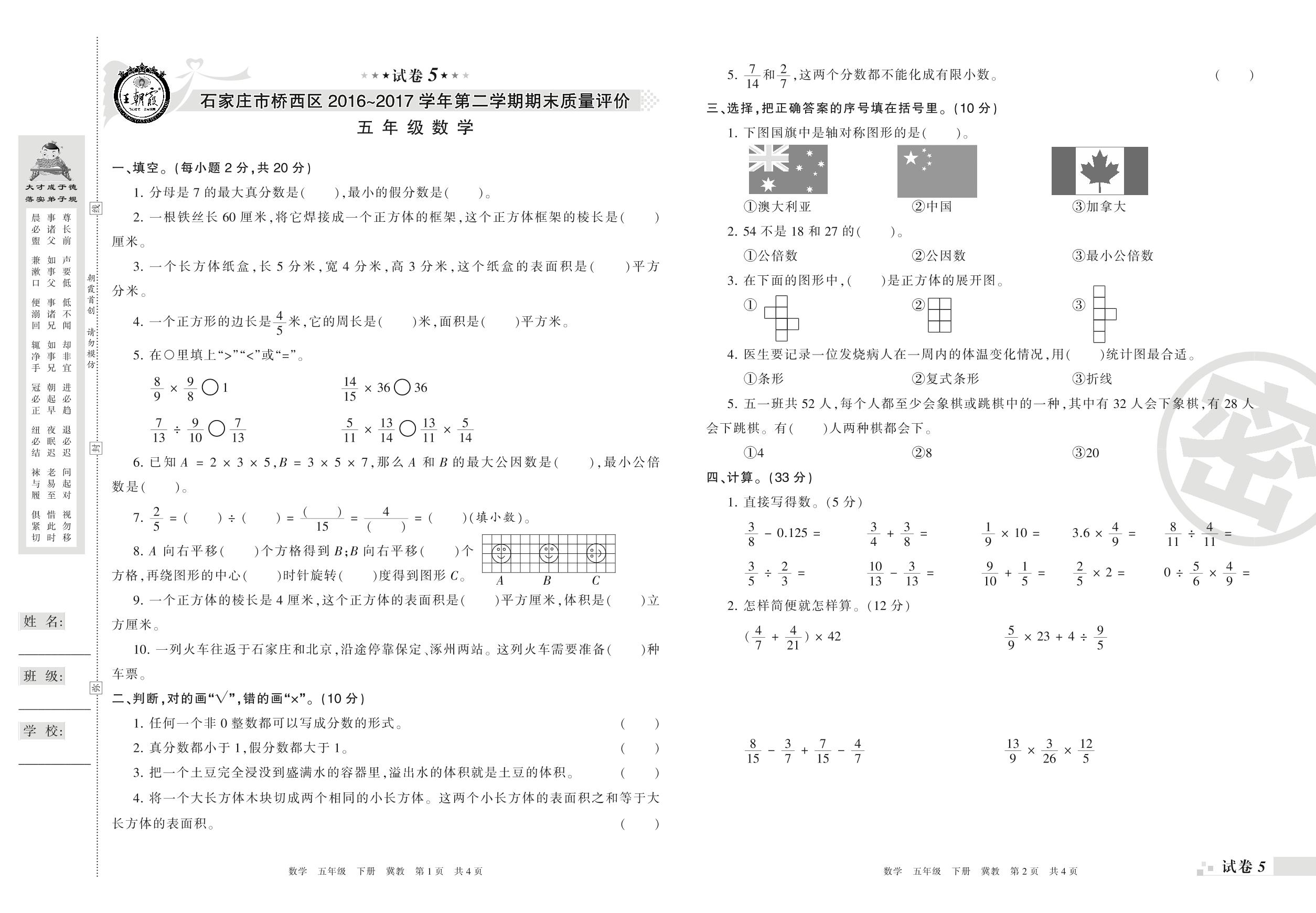 2016-2017学年第二学期石家庄市桥西区五年级数学试卷(冀教版)【5】