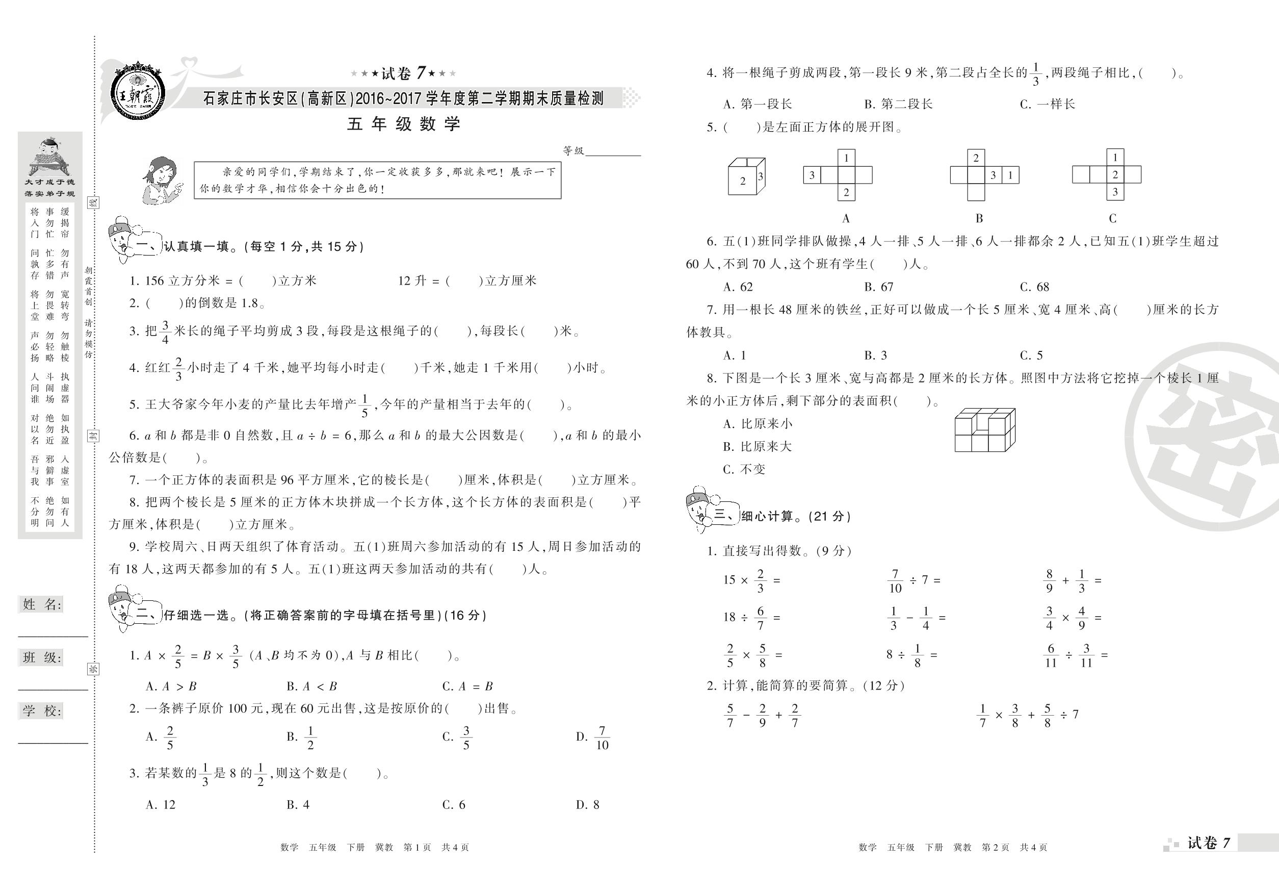 2016-2017学年第二学期石家庄市长安区、高新区五年级数学试卷(冀教版)【7】