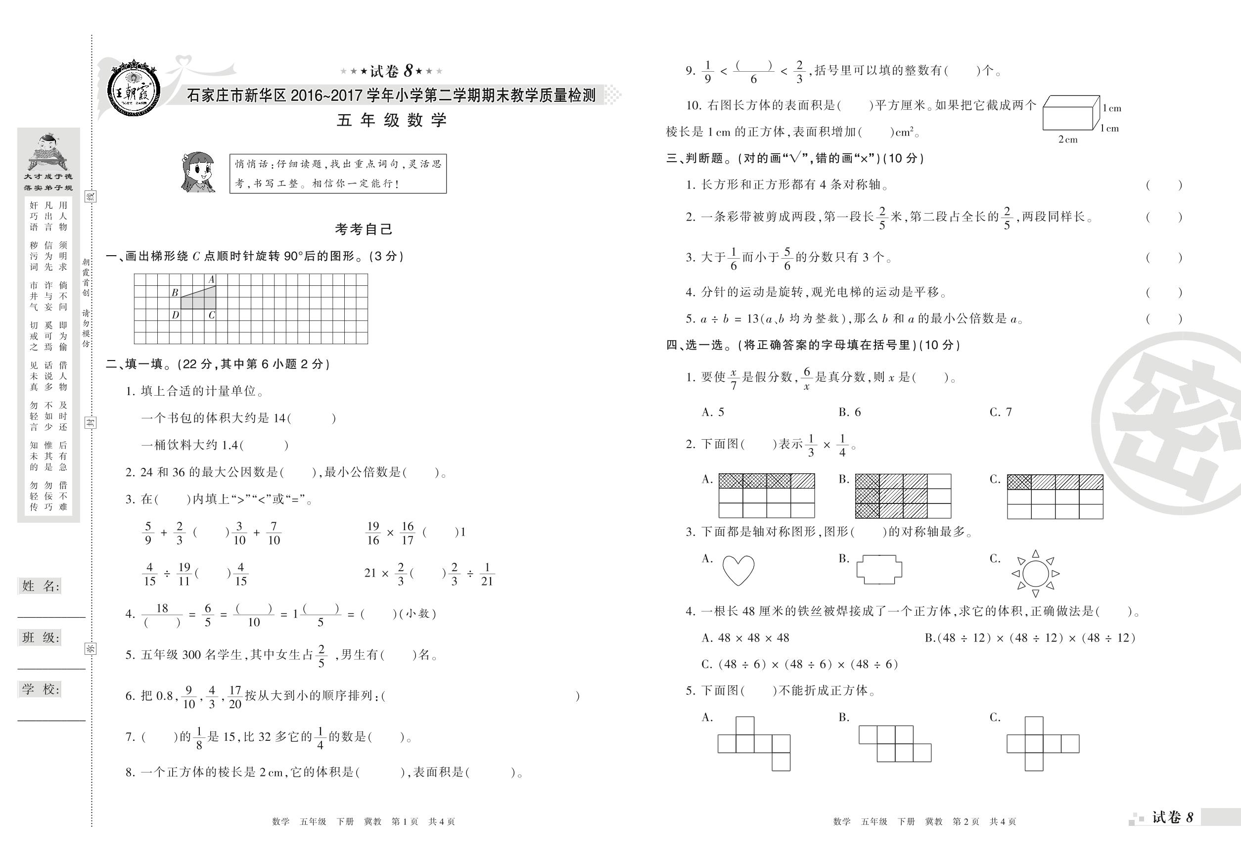 2016-2017学年第二学期石家庄市新华区五年级数学试卷(冀教版)【8】
