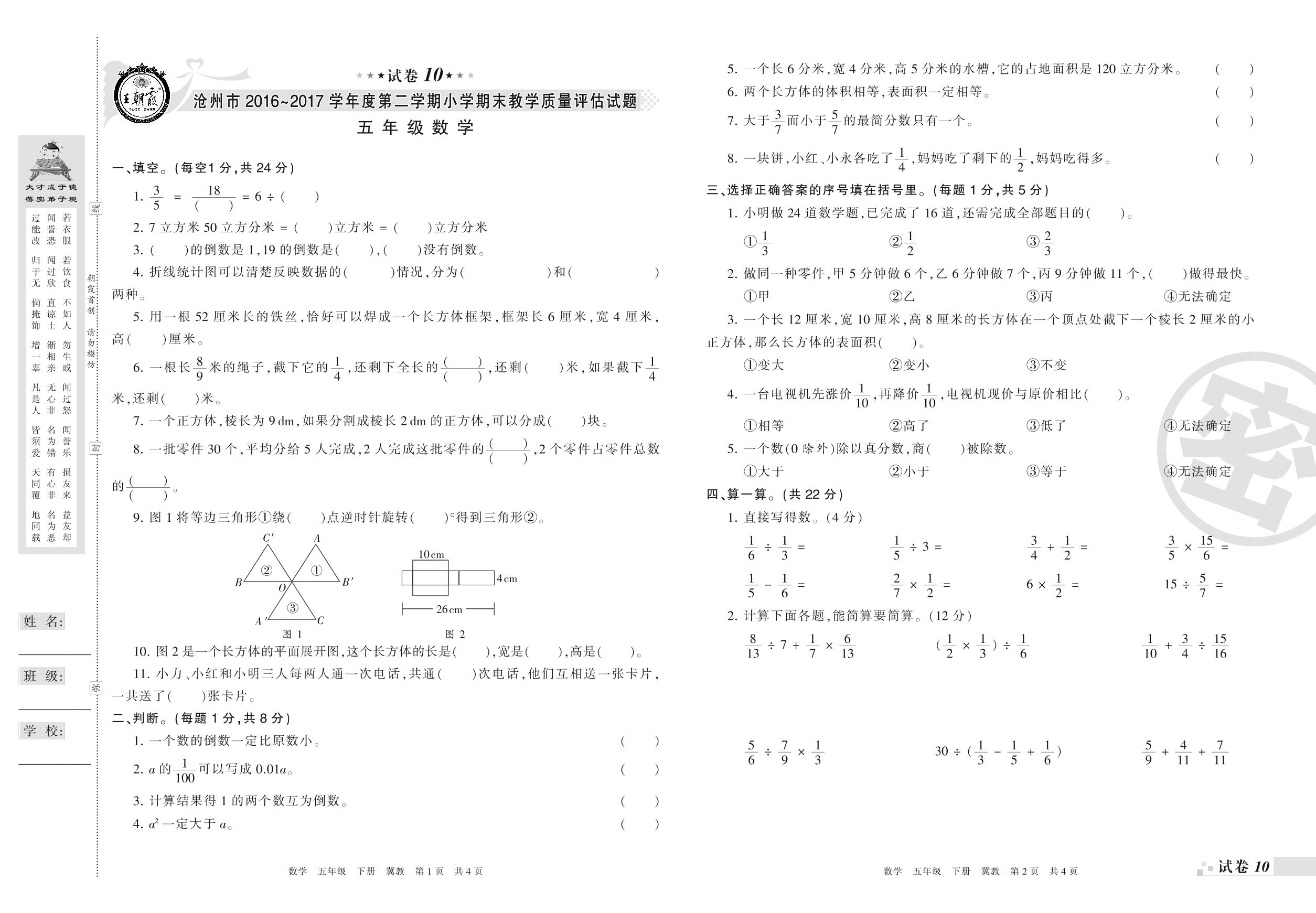 2016-2017学年第二学期沧州市五年级数学试卷(冀教版)【10】