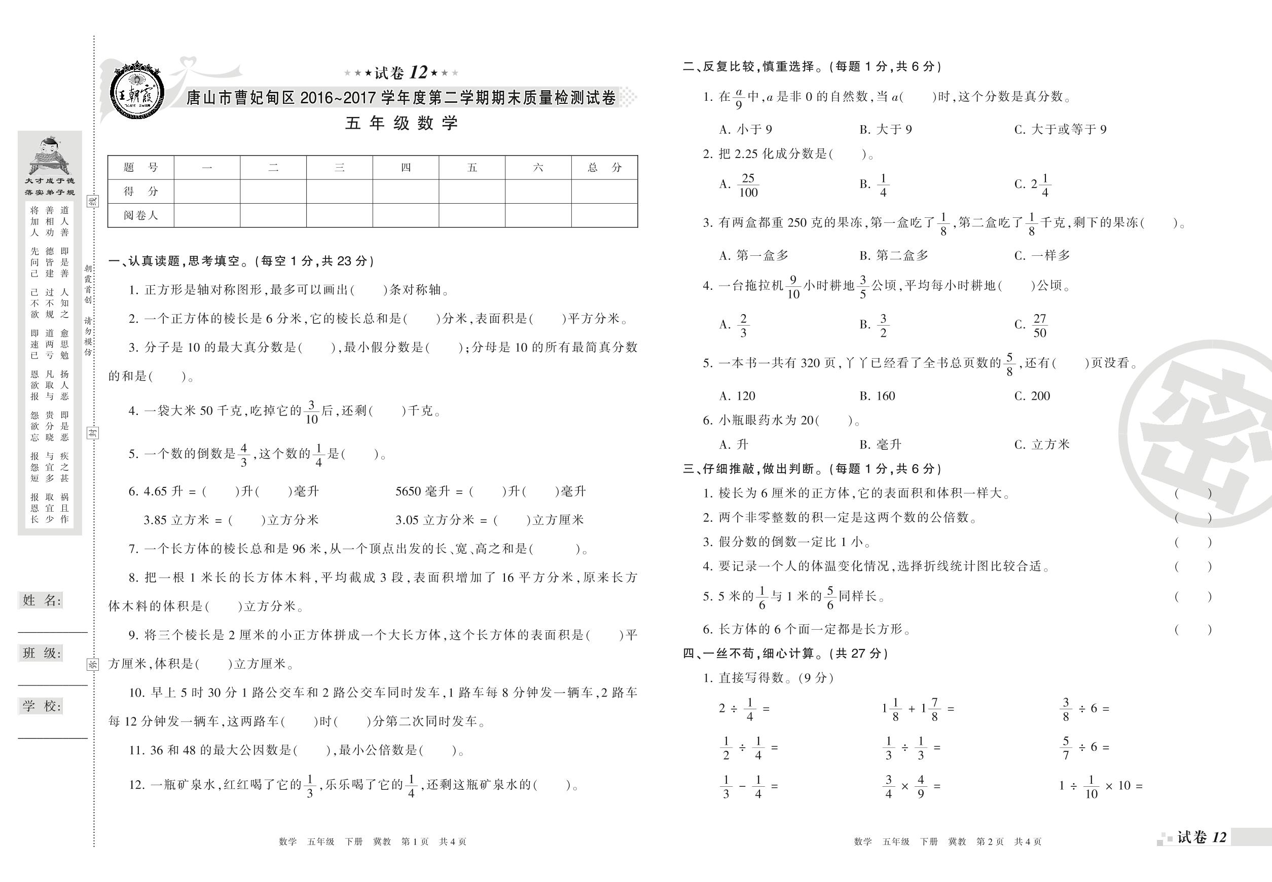 2016-2017学年第二学期唐山市曹妃甸区五年级数学试卷(冀教版)【12】