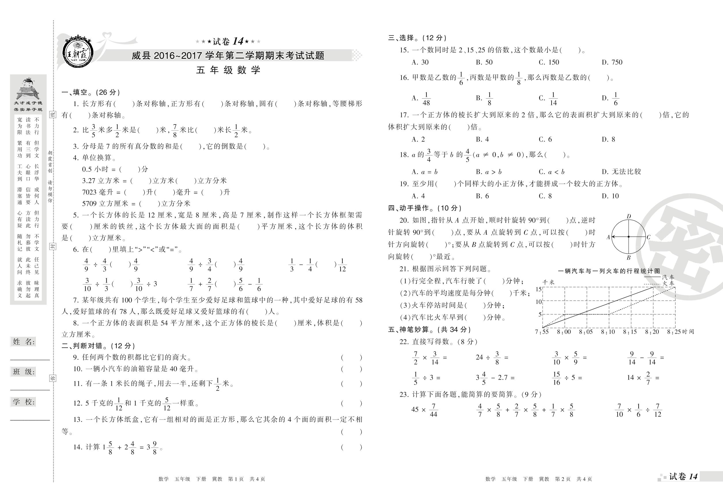 2016-2017学年第二学期邢台市威县五年级数学试卷(冀教版)【14】
