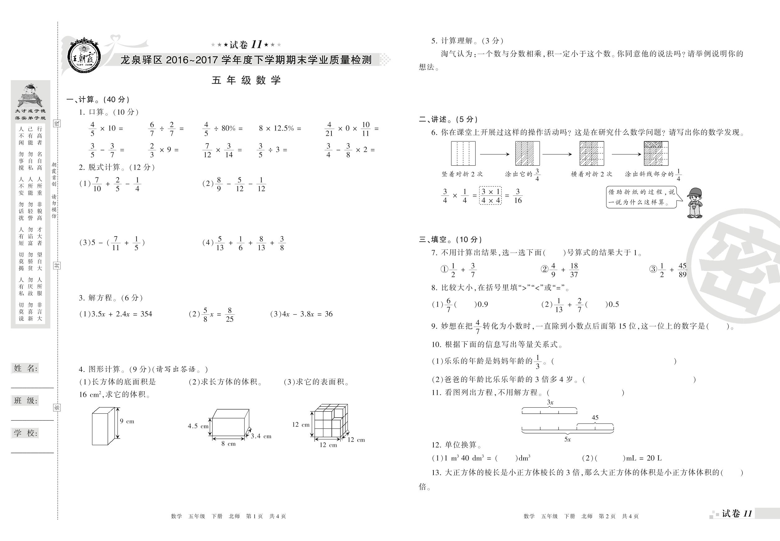 2016-2017学年第二学期成都市龙泉驿区五年级数学试卷(北师版)【11】