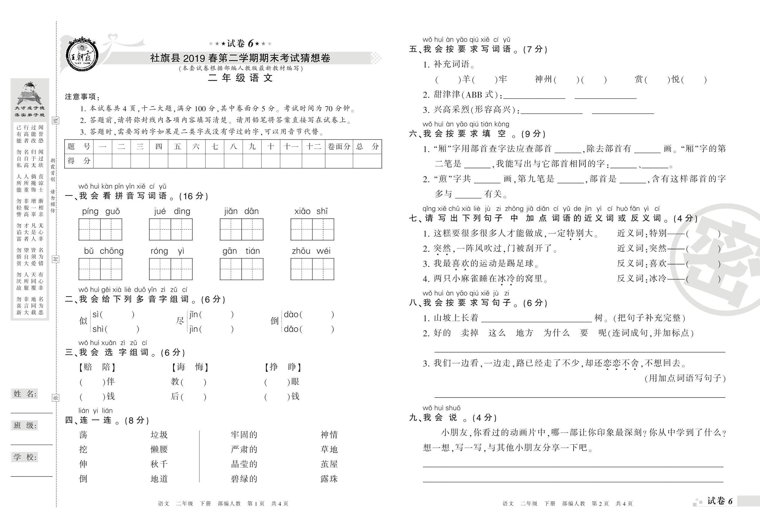 2017-2018学年第二学期南阳市社旗县二年级语文试卷(人教版)【6】