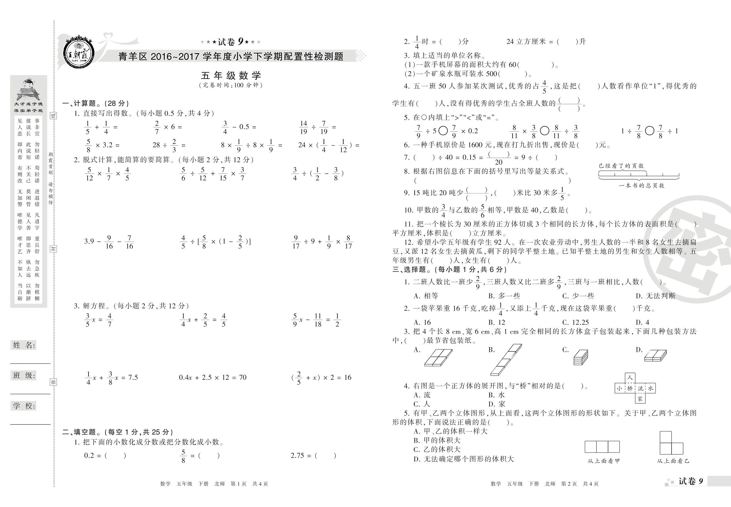 2016-2017学年第二学期成都市青羊区五年级数学试卷(北师版)【9】