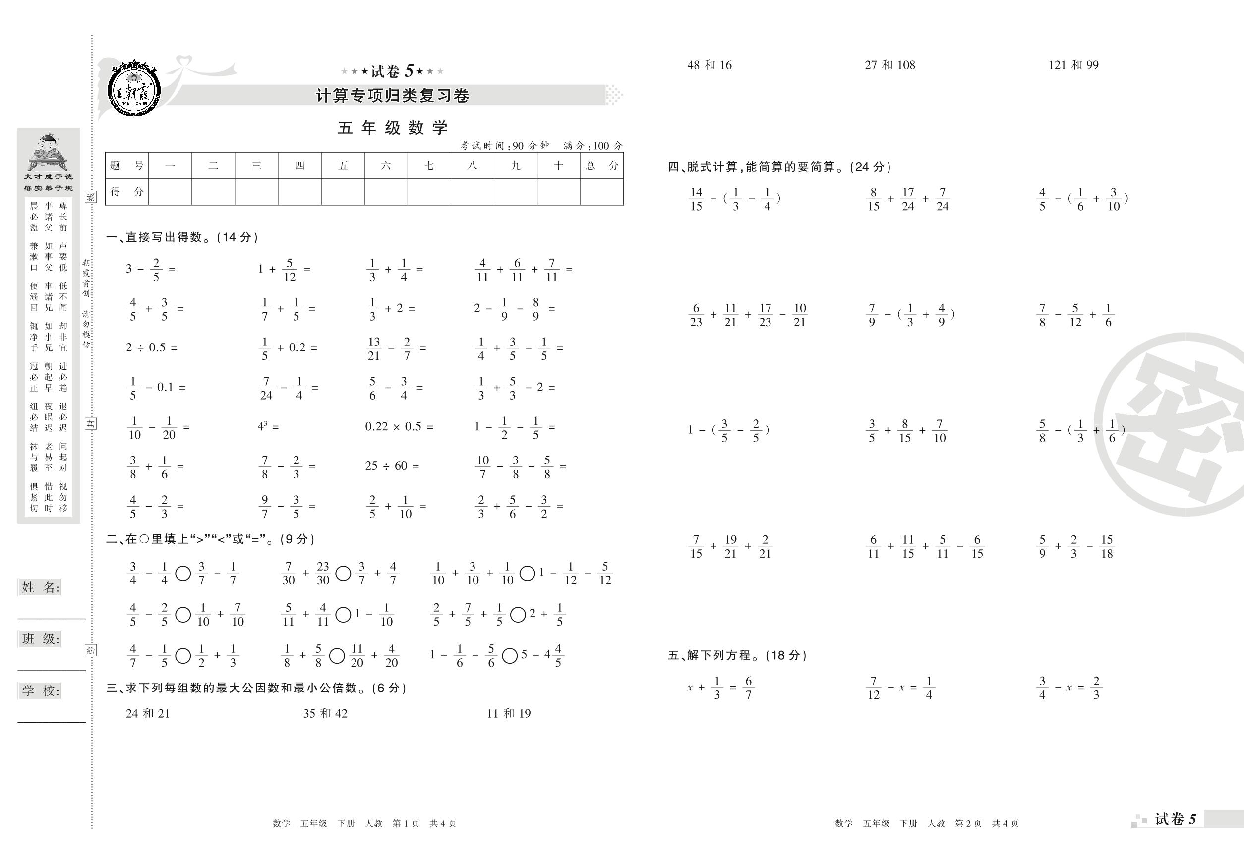 王朝霞期末专项卷——计算专项归类复习卷五年级下册数学(人教版)_R220125155314334【5】